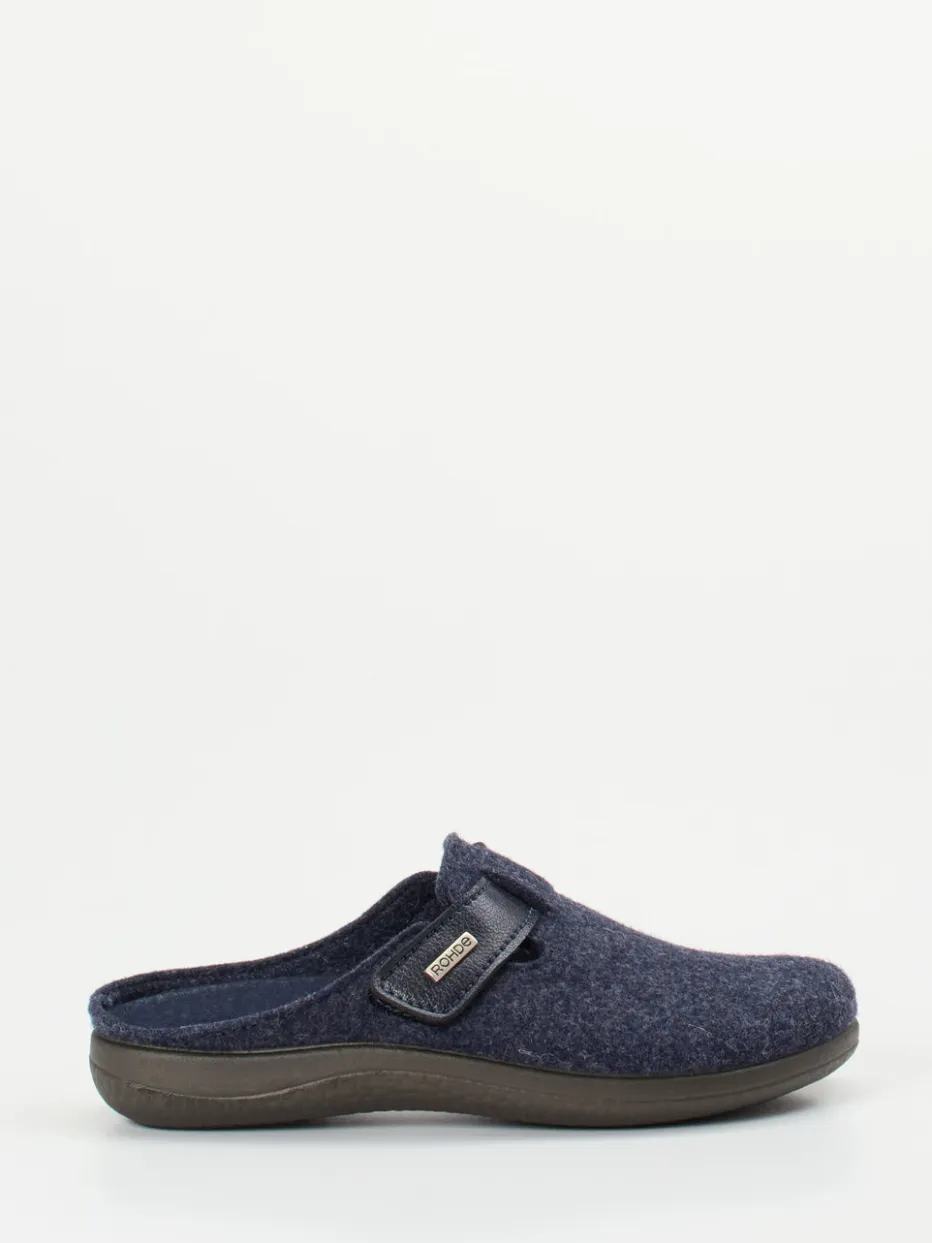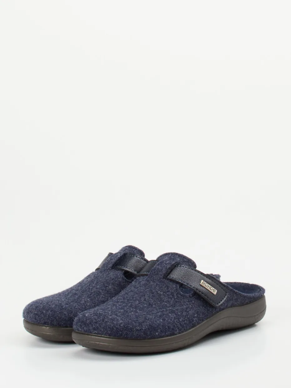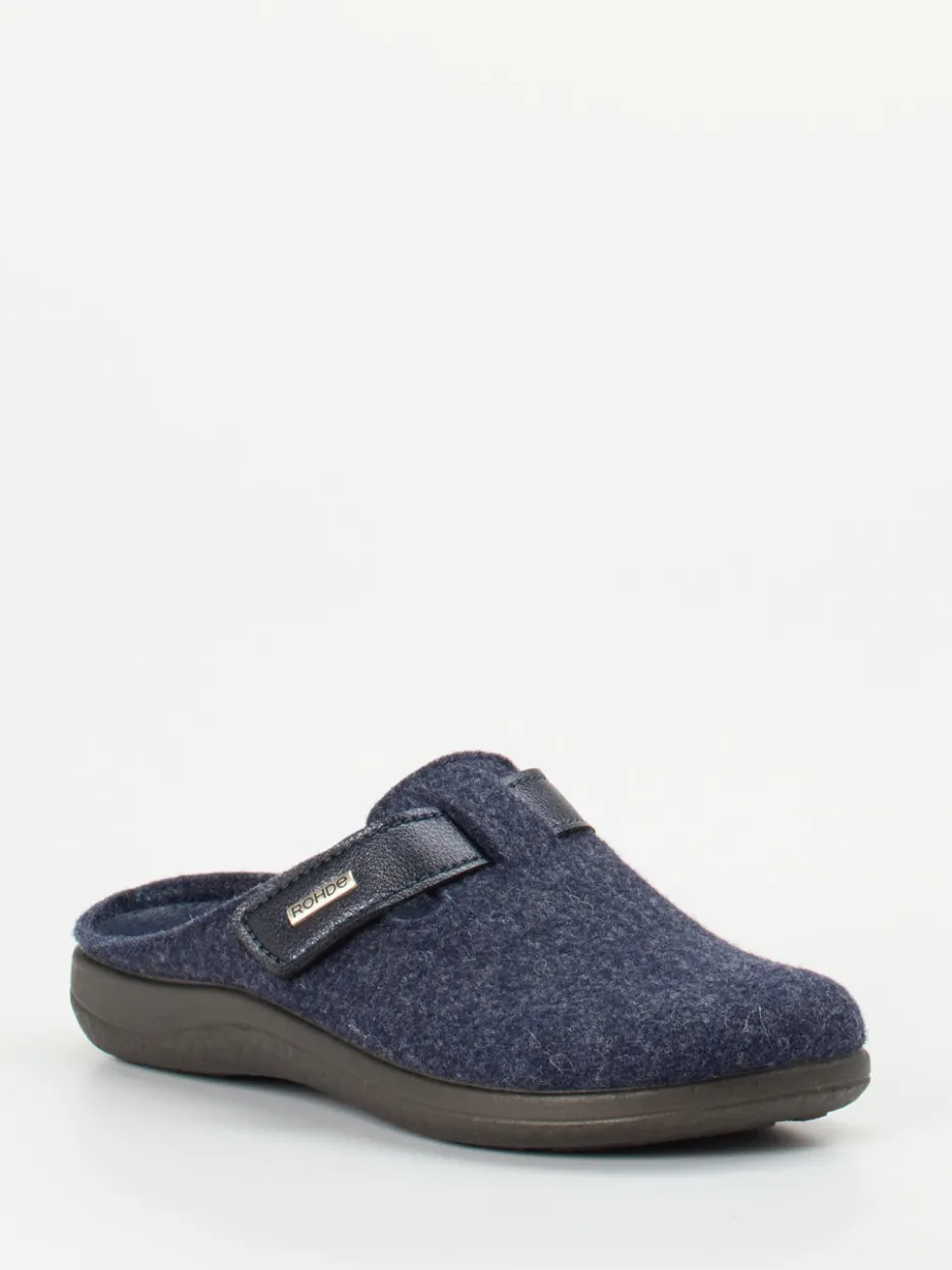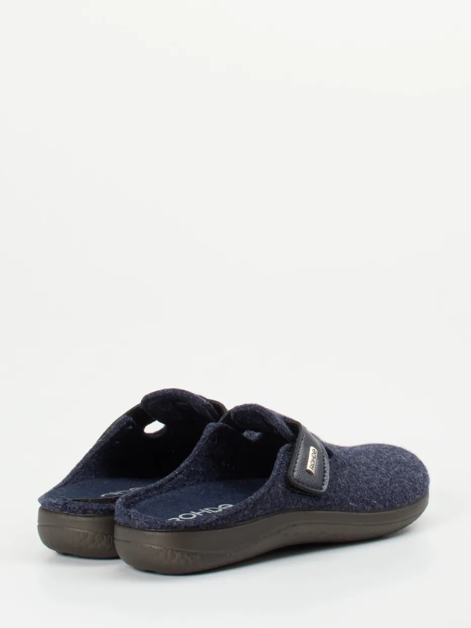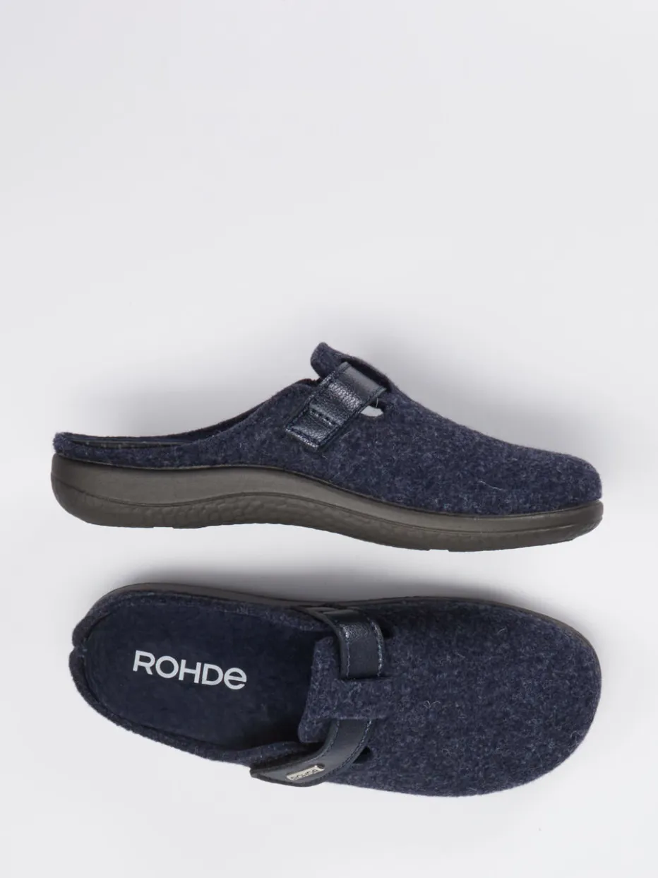 Wärme trifft Funktion.Die Marke Rohde präsentiert mit dieser Pantoletten-Variante einen wohldurchdachten Hausschuh für den Alltag. Ideal zum Entspannen zuhause: Das dunkelblaue Filzmaterial mit filziger Oberfläche sorgt für angenehme Wärme, während der individuell einstellbare Klettverschluss über dem Rist sicheren Halt ermöglicht. Die geformte Gummisohle mit Shock-Absorber bietet ergonomischen Gehkomfort selbst auf harten Böden. Der offene Fersenbereich erlaubt ein schnelles An- und Ausziehen, dezente Ton-in-Ton-Nähte und ein metallisches Markenbadge unterstreichen das zurückhaltend moderne Design. Perfekt kombinierbar zu Loungewear oder Wollsocken. Rohde steht für zeitlose Funktionalität mit komfortbetontem Charakter.
