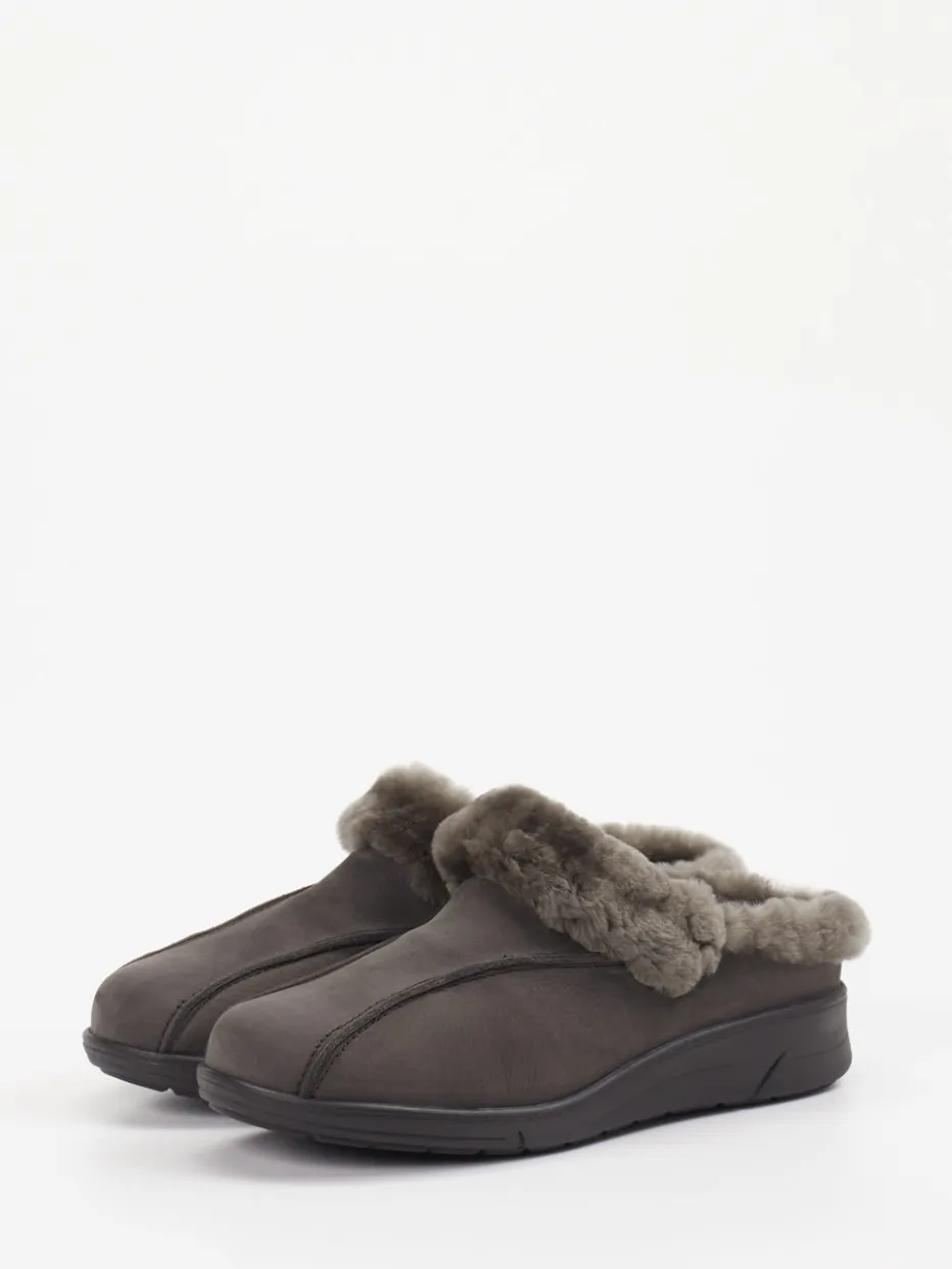 Gemütlichkeit für kalte Tage. Sabalin präsentiert stilvolle Damenpantoffeln für entspannte Momente zu Hause. Die geschlossene Silhouette mit offenem Fersenbereich bietet unkomplizierten Komfort – perfekt für entspannte Abende. Gefertigt aus Nubukleder mit matter Oberfläche und Ton-in-Ton-Nähten, zeigt sich das Modell in einem ruhigen Anthrazitgrau. Ein flauschiger Kragen aus Kunstfell umschließt den Fuß weich, während die profilierte PU-Laufsohle sicheren Halt auf glatten Böden bietet. Die rutschhemmende Sohle und das weich gefütterte Innenleben entsprechen dem Trend zu Cosy Winter Essentials. Harmoniert ideal mit Fleece-Hausanzügen oder Thermo-Socken. Ein Hausschuh für wohlige Wärme und stilvolle Loungewear-Momente.