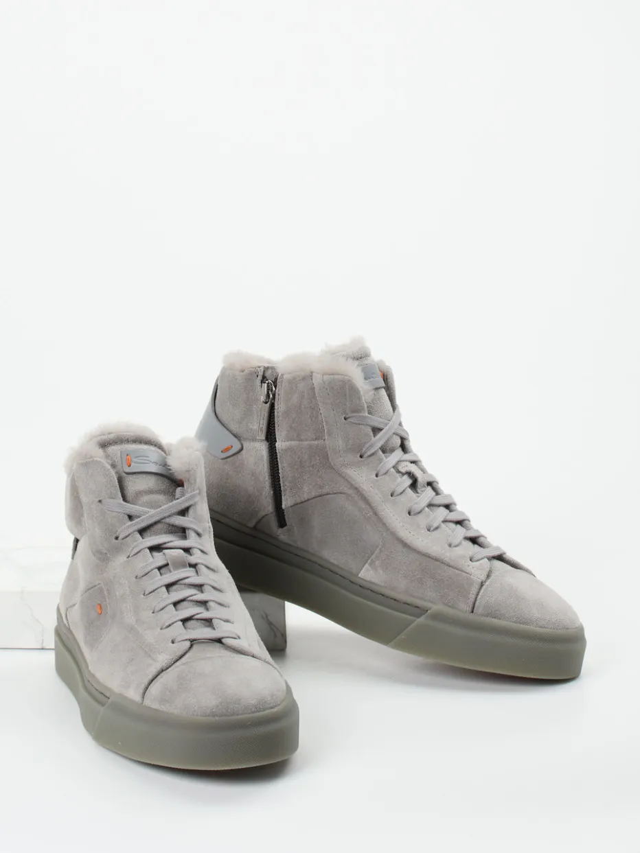 Stilvoll durch den Winter.Die italienische Marke Santoni zeigt mit diesem High-Top-Sneaker aus Veloursleder ihre handwerkliche Eleganz. Ideal für kühle Tage bietet das Modell dank echtem Lammfellfutter ein angenehm warmes Tragegefühl. Das steingraue Obermaterial mit matter Struktur wird von olivgrauer Gummisohle und orangefarbenen Nähten akzentuiert. Ein seitlicher Reißverschluss vereinfacht den Einstieg, während die klassische Silhouette alltagstaugliche Lässigkeit versprüht. Design-Details wie tonige Schnürung und graue Kunststoffapplikationen runden den Look ab. Inspiriert von urbanem Minimalismus und „Quiet Luxury“. Ein stylischer Begleiter mit markentypischer Souveränität und Funktionalität.