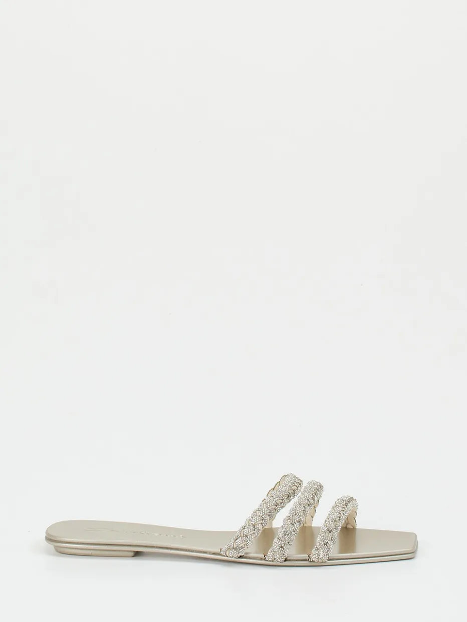 Ideal für elegante Events unter freiem Himmel, begeistert dieser Slideschuh durch seine champagnerfarbene Metallic-Optik und das luxuriöse Finish. Die geflochtenen Riemen aus Metallic-Material sind allover mit kristallfarbenem Strass besetzt und setzen schimmernde Akzente. Die flach-eckige Silhouette auf Carréleisten und die offene Zehenpartie unterstreichen einen modernen Purismus. Ohne Verschluss gefertigt, sorgt das Modell für unkomplizierten Komfort an warmen Tagen. Trendgerecht fügt es sich in die Ästhetik von „Quiet Luxury“ und metallicbasiertem Y2K-Revival ein.