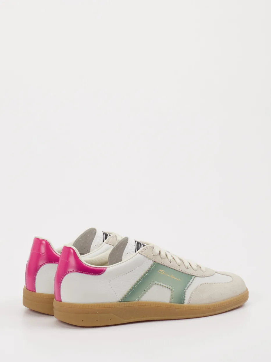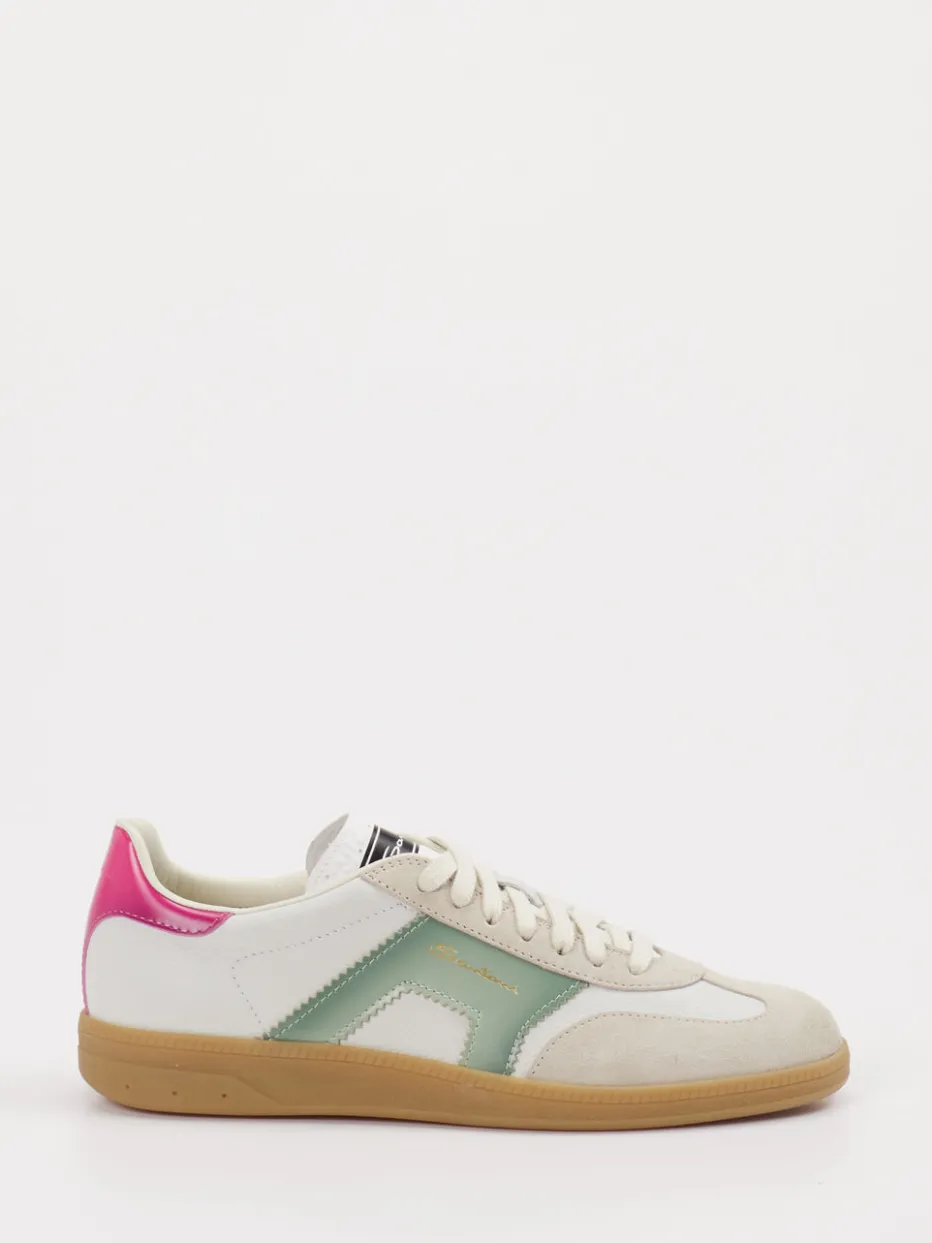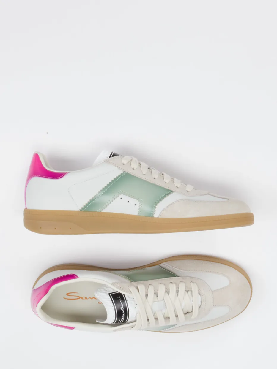Unverwechselbar mit 90s-Flair. Santoni präsentiert einen Retro-Sneaker, der Unisex tragbar ist und detailreich gestaltet wurde. Ideal für entspannte Alltagssituationen mit Stilanspruch verbindet dieses Modell eine flache, runde Silhouette mit einer harmonischen Farbkombination: cremeweiße Basis mit pastellgrünem Seitenelement und pinkem Fersenakzent. Velour- und Glattleder vereinen sich zu einer spannenden Haptik, ergänzt durch eine naturfarbene Gummisohle und ein seitlich geprägtes Goldlogo. Die Schnürung sorgt für sicheren Halt, das ungefütterte Innenleben für Leichtigkeit. Inspiriert vom Streetwear-Trend der 90er passt der Sneaker perfekt zu lässigen Denim-Looks oder auch pastellfarbenen Kombinationen. Ein stilsicheres Statement mit zeitgemäßem Retro-Appeal in Santoni-Manier.