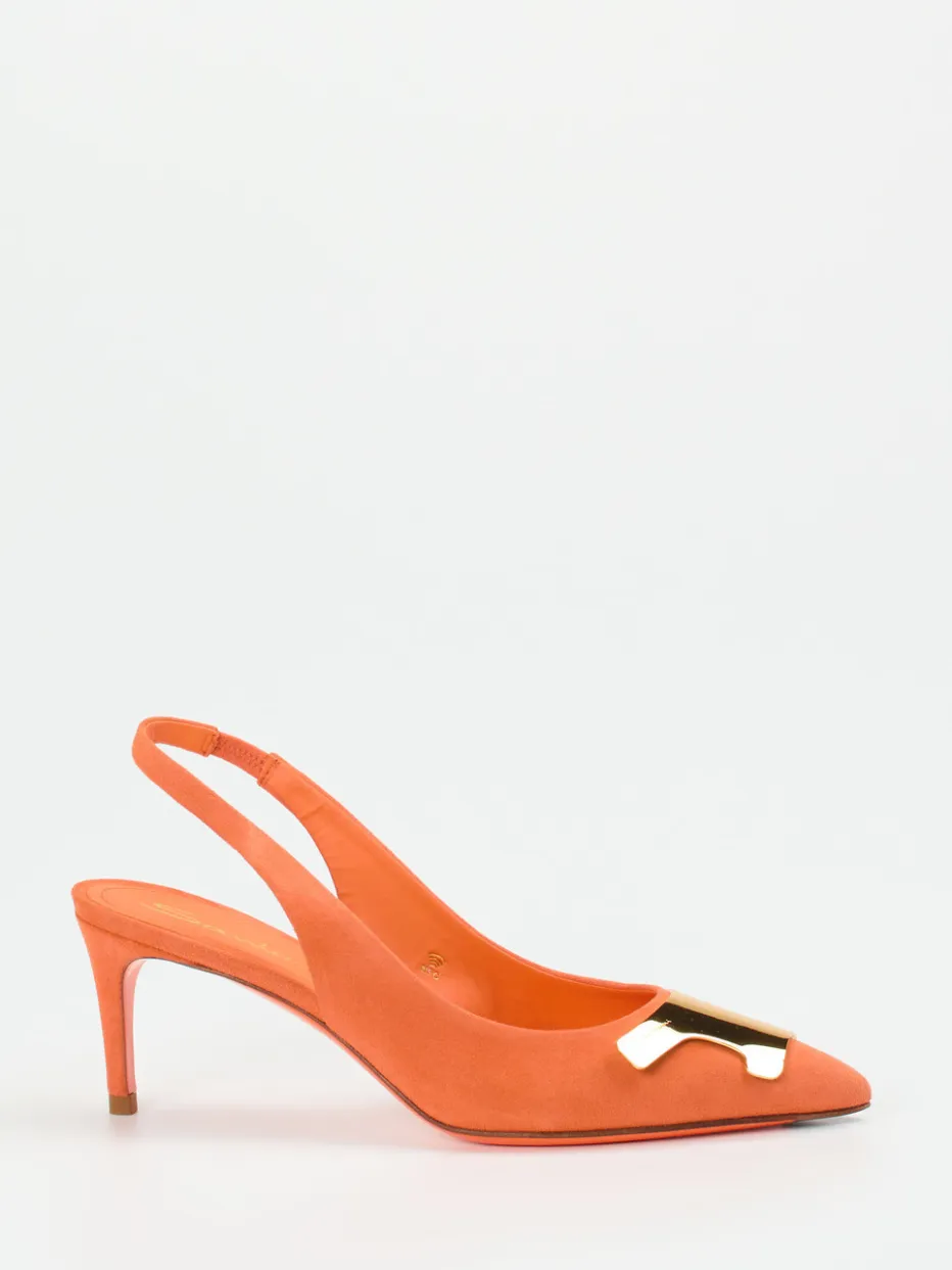 Design trifft Farbe mit Aussagekraft.Santoni präsentiert elegante Damen-Slingback-Pumps mit exklusivem Charakter. Ideal für festliche Anlässe oder den stilvollen Auftritt am Abend: Das Modell kombiniert fein angeschliffenes Veloursleder in kräftigem Koralle-Orange mit einem elastischen Slingback-Riemen. Die spitz zulaufende Form und die auffällige, goldfarbene Applikation auf der Vorderkappe erzeugen eine moderne, minimalistische Linienführung. Eine Ledersohle und ein 6,5 cm hoher Absatz sorgen für Komfort mit hochwertigem Anspruch. Akzente aus der „Bold Colors“-Linie unterstreichen den fashion-forward Look. Ein stilprägendes Statement mit italienischem Feinsinn.