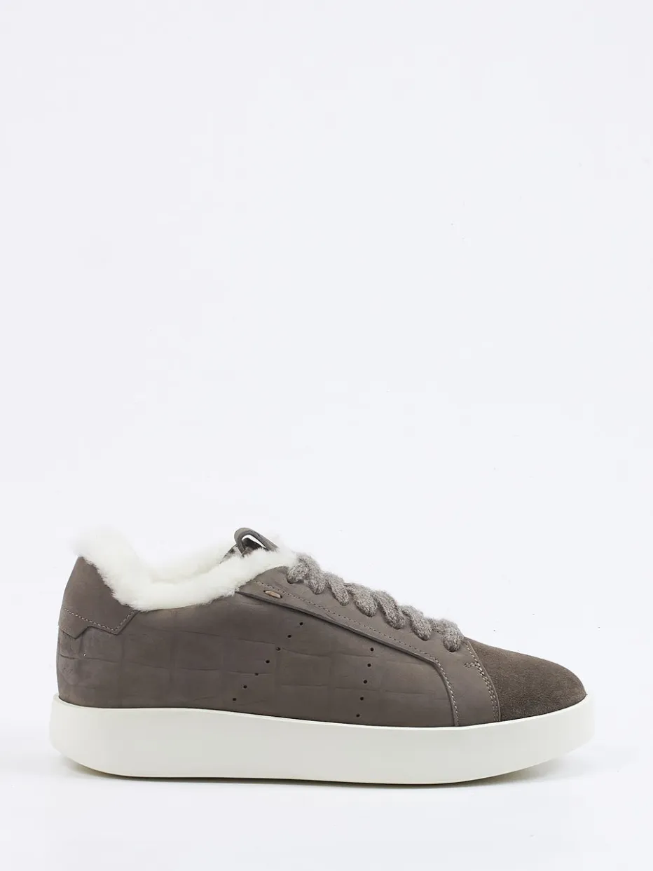 Stil trifft Wärme mit Struktur.Bei diesem Damen-Sneaker von Santoni vereint sich luxuriöse Anmutung mit wintertauglichem Komfort. Ideal für entspannte Stadtspaziergänge an kühlen Tagen: Der Sneaker präsentiert sich in grau gefärbtem, geprägtem Leder mit matter Oberfläche und Ton-in-Ton-Krokoprägung – ergänzt um seitliche Perforationen. Das Naturfarbene Lammfellfutter am Schaftrand sorgt für behagliche Wärme, während die weiße, leicht erhöhte Gummisohle für Trittsicherheit steht. Die klassisch abgerundete Form, Zuglasche und der Markenschriftzug auf der Zunge setzen dezente Akzente. Minimalistische Streetwear-Einflüsse treffen auf Quiet-Luxury-Chic. Ein Premium-Komfortmodell – perfekt abgestimmt auf die Wintergarderobe mit Anspruch.