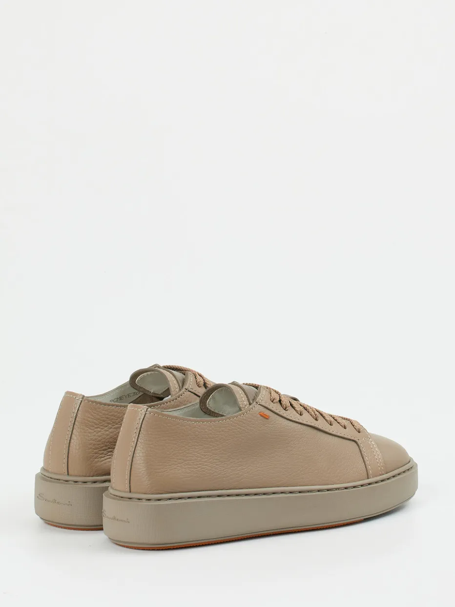 Zurückhaltender Luxus für jeden Tag.Der Damen-Sneaker von Santoni überzeugt als stilvoller Allrounder. Sein weiches, ungefüttertes Kalbleder mit genarbter Oberfläche präsentiert sich in einem warmen Beigebraunton. Der klassische Low-Top-Schnitt, eine flexible Gummisohle in Taupe sowie tonige Schnürsenkel unterstreichen den cleanen Look. Dezente orangefarbene Logodetails und eine verstärkte Ferse setzen subtile Akzente. Durch seine klare Linienführung passt der Sneaker zu minimalistischen Outfits und folgt aktuellen „Quiet Luxury“-Strömungen. Modisch wie funktional ist er die perfekte Wahl für Büro und Freizeit. Ein Statement für handwerkliche Qualität in modernem Design.