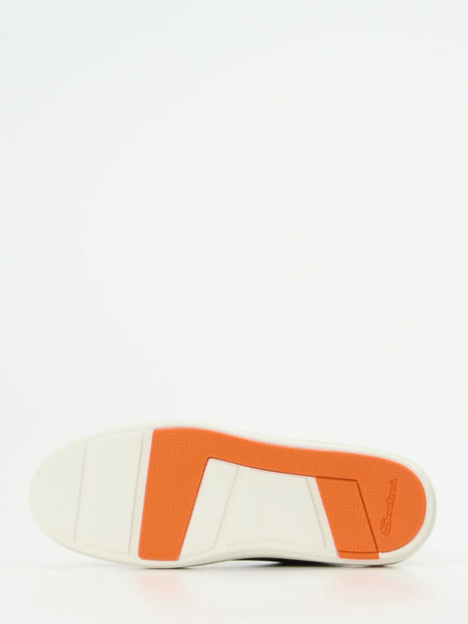 Stilvoll durch Stadt und Alltag.Der Santoni Sneaker überzeugt als hochwertiger Low-Top für Herren. Er verbindet minimalistisches Design mit sportiver Eleganz. Ideal für urbane Looks: Dunkelblaues Lammleder mit matter Oberfläche verleiht eine edle Erscheinung. Die abgerundete Form und die Ton-in-Ton Schnürung unterstreichen den klaren Stil. Eyecatcher ist die profilierte Offwhite-Gummisohle mit orangefarbenem Akzent. Ob im Büro oder in der Freizeit – der Look passt vielseitig zur Chino oder zum Anzug. Der Schuh orientiert sich an den Trends Quiet Luxury und Color-Blocking. Ein stilvoller Begleiter – typisch Santoni mit makelloser Handwerkskunst.