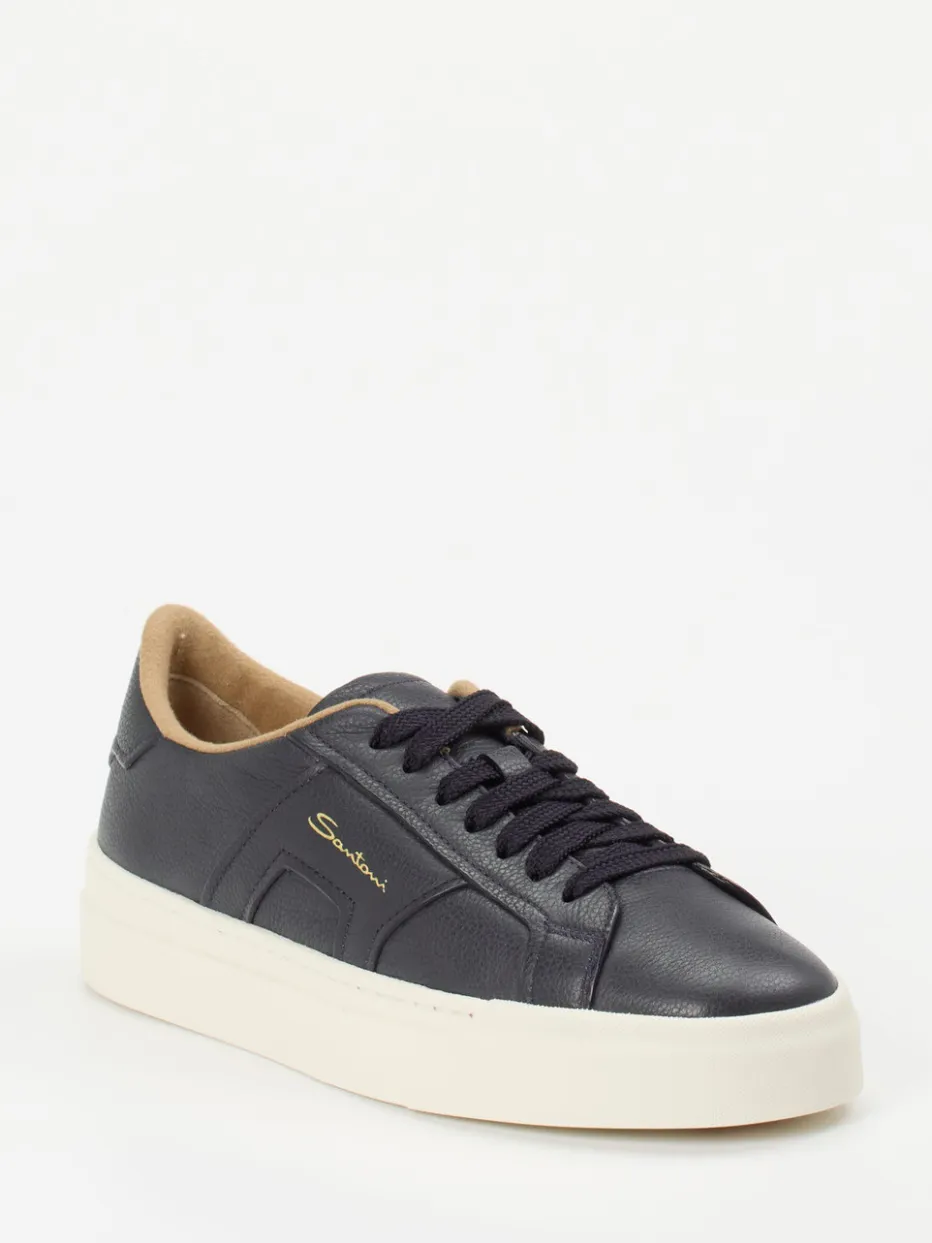 Santoni präsentiert diesen Low-Top-Sneaker aus butterweichem Lammleder in Dunkelblau. Die cleane Silhouette und das dezente Branding verbinden sportiven Komfort mit modernen Designansprüchen.