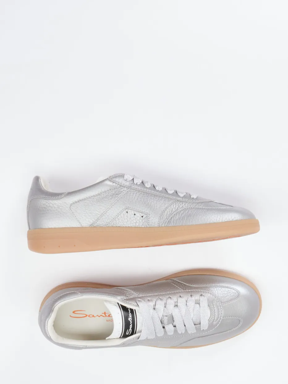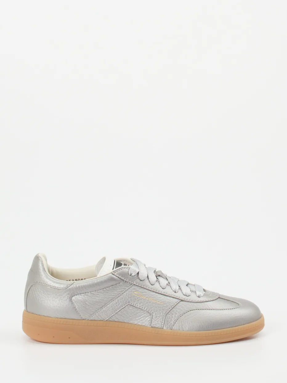 Für entspannte City-Walks oder abendliche Events konzipiert, besticht das Modell durch silbernes Metallicleder mit genarbter Oberfläche, ergänzt durch Ton-in-Ton-Nähte und eine klassische Schnürung. Die flache Silhouette im Stil der Retro-Sportswear trifft auf eine robuste Gumsohle in Hellbraun – ein markanter Kontrast, der den urbanen Look unterstreicht. Eine seitliche Logo-Prägung rundet das Design ab. Ideal zu minimalistischer Streetwear oder monochromen Outfits.
