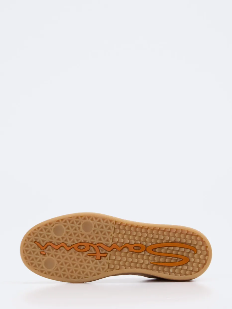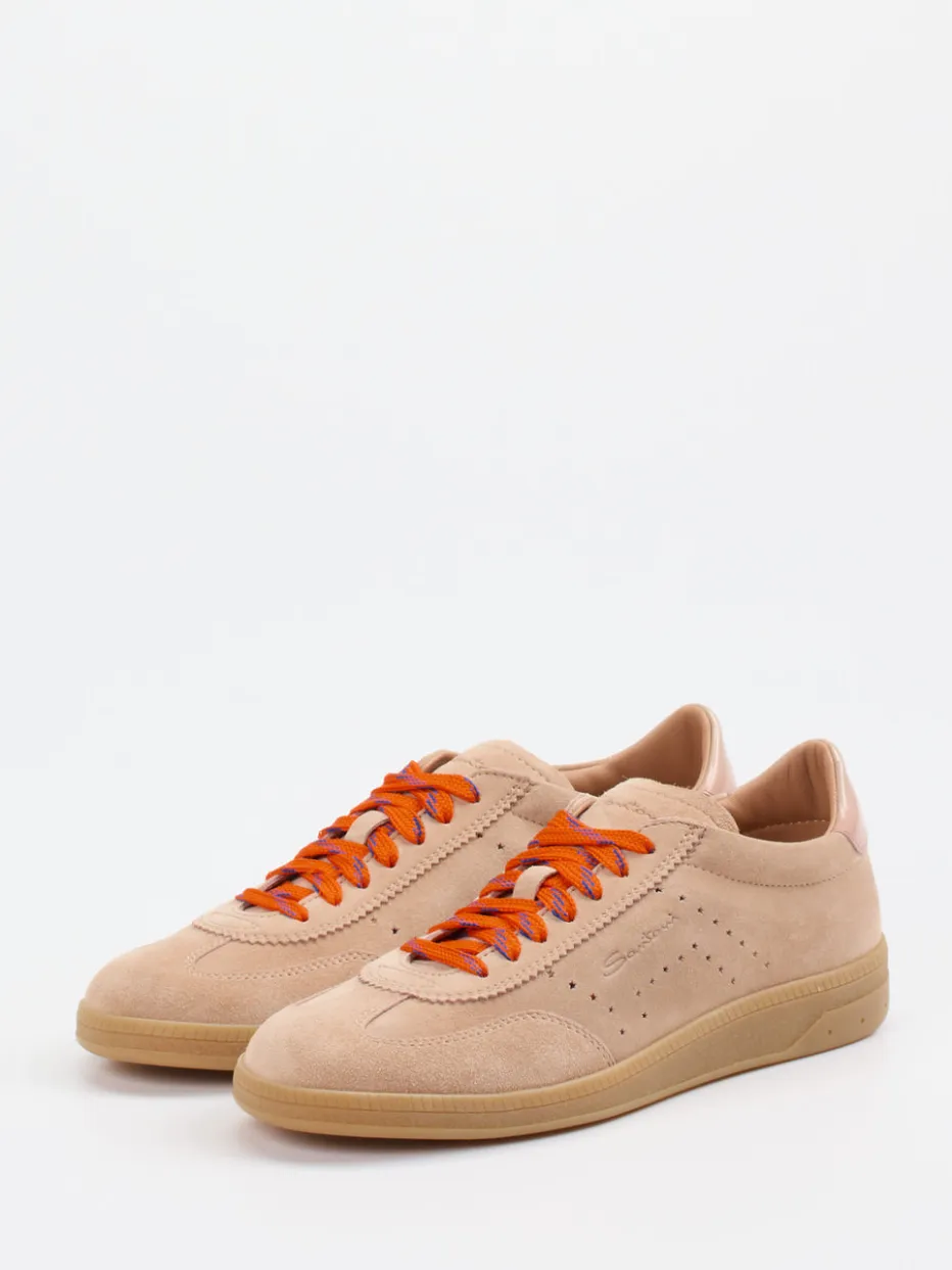Aus handschuhweichem Veloursleder gefertigt, strahlt das Modell in zartem Beige mit samtiger Oberfläche. Die klassisch flache Silhouette wird durch orangefarbene, teils blau geflochtene Schnürsenkel und eine rosé-glänzende Fersenkappe akzentuiert. Sternförmige Perforationen sorgen für Leichtigkeit und Detailtiefe. Die flexible Gummisohle mit Markenlogo bietet zuverlässigen Komfort für entspannte Freizeitmomente. Dezente Ton-in-Ton-Nähte und seitliche Logo-Prägung runden das Design trendbewusst ab. Passt perfekt zu Chinohose und Overshirt in Naturtönen.