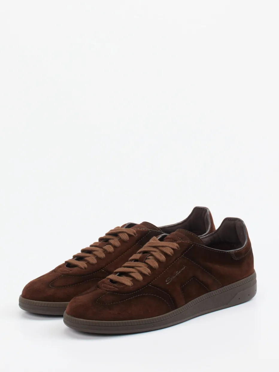 Schlichte Eleganz für urbane Komfortmomente.Der edle Herren-Sneaker von Santoni überzeugt in der Kategorie Low-Top durch formvollendetes Design und luxuriöses Material. Ideal für den dezent gepflegten Auftritt bei mildem Herbstwetter: Das schokobraune Veloursleder präsentiert sich samtig matt mit tonalen Nähten und klarer Linienführung. Die klassische Silhouette mit Schnürung wird durch eine flexible Gummisohle ergänzt, die durch ein markantes orangefarbenes Branding auffällt. Retro-Sportswear-Einflüsse und die Anmutung von „Quiet Luxury“ treffen auf praktischen Komfort – inklusive herausnehmbarem Memory Foam-Fußbett. Perfekt in Kombination mit Chinohose und Kaschmirpullover. Ein Saison-Basic, das italienisches Feingefühl und hochwertigen Tragekomfort verbindet.