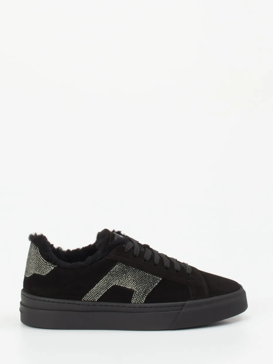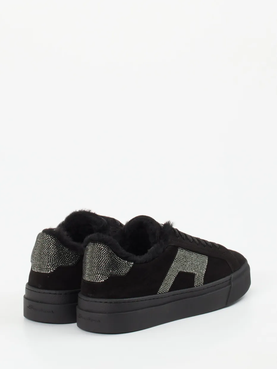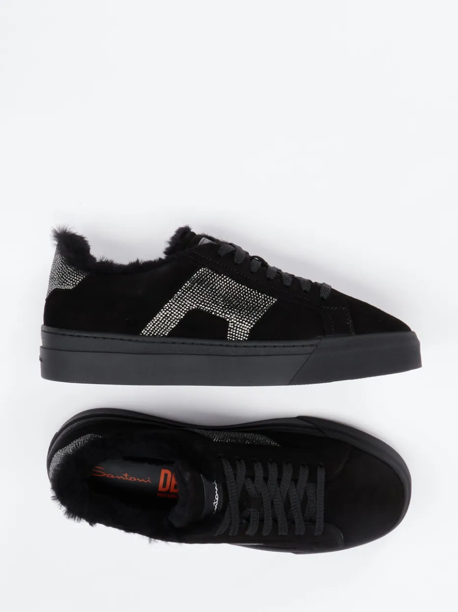 Glamour trifft Komfort im Winter.Der Sneaker von Santoni vereint luxuriöses Design mit wohliger Wärme für stilbewusste Freizeitmomente. Das schwarze Veloursleder zeigt sich in matt strukturierter Optik und wird durch silbergraue Strassapplikationen elegant akzentuiert. Die klassisch flache Silhouette mit Ton-in-Ton-Schnürung und flauschigem Lammfellfutter bietet ein hohes Maß an Komfort, selbst an kalten Tagen. Ein markanter Logo-Print auf der Gummisohle rundet das Design ab. Im Streetwear-Stil mit Quiet-Luxury-Note harmoniert der Schuh ideal mit monochromen Winter-Outfits. Ein exklusiver Damen-Sneaker, der funktionelle Wärme mit fein gesetztem Glamour verbindet – made by Santoni.