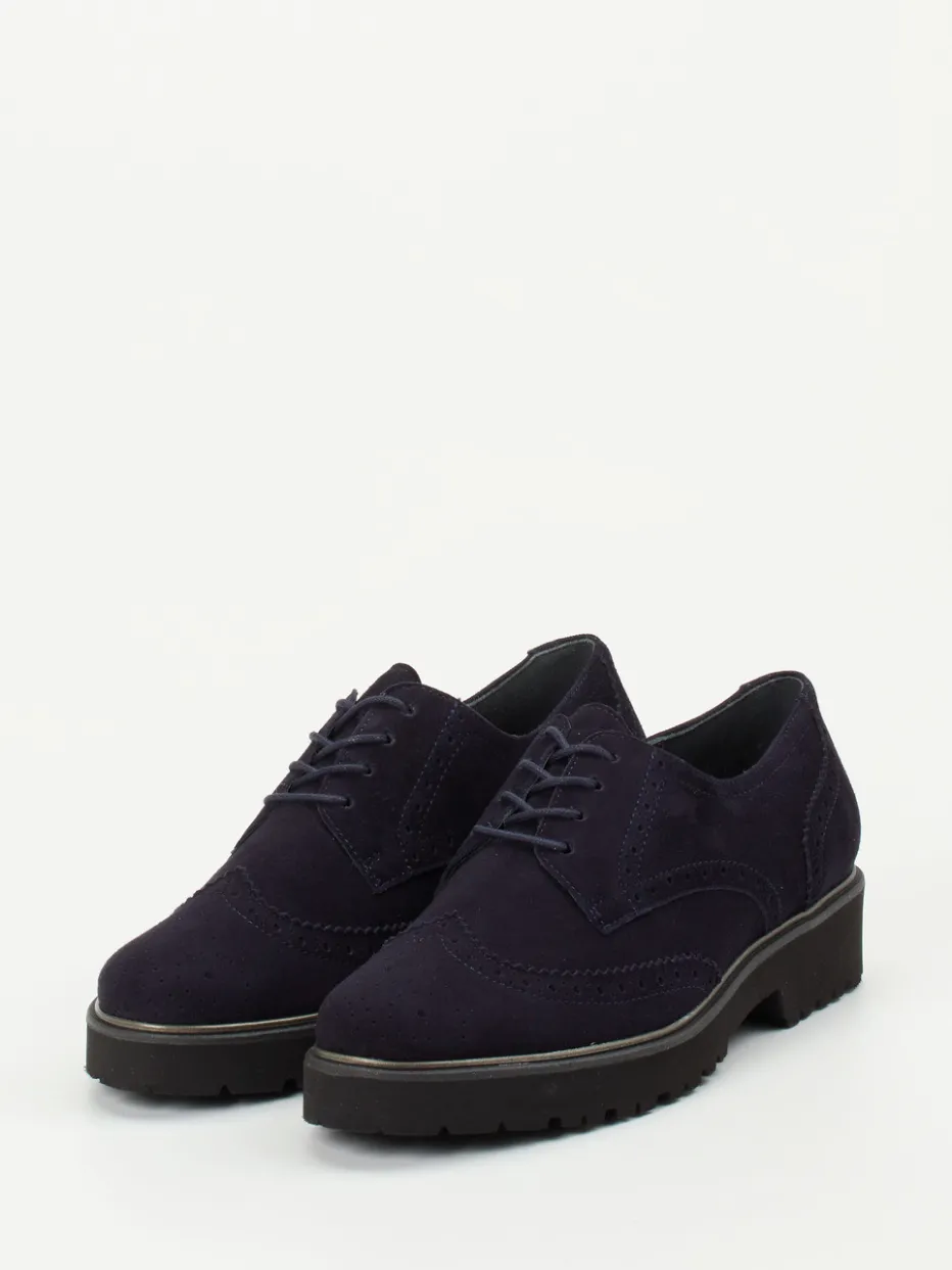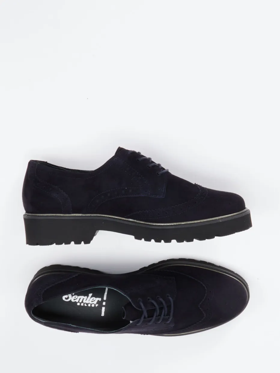 Vielseitig durch Herbst und Winter.Semler präsentiert diesen eleganten Brogue-Halbschuh für Damen. Ideal für geschäftige Tage oder stilvolle Büro-Outfits: Der dunkelblaue Brogue punktet mit hochwertigem Veloursleder, das matt und samtig angeschliffen wirkt. Die klassische Flügelkappung mit dezenten Ton-in-Ton-Nähten und Zierlochung unterstreicht die heritage-inspirierte Linienführung. Eine fein profilierte, leicht erhöhte Gummisohle mit goldfarbener Umrandung bietet sicheren Halt und femininen Akzent. Schnürung und bequeme Weite G sorgen für Komfort. Der Look entspricht dem aktuellen Quiet-Luxury-Trend. Komfort und Stilsicherheit – ein Schuh mit charakteristischem Semler-Finish.