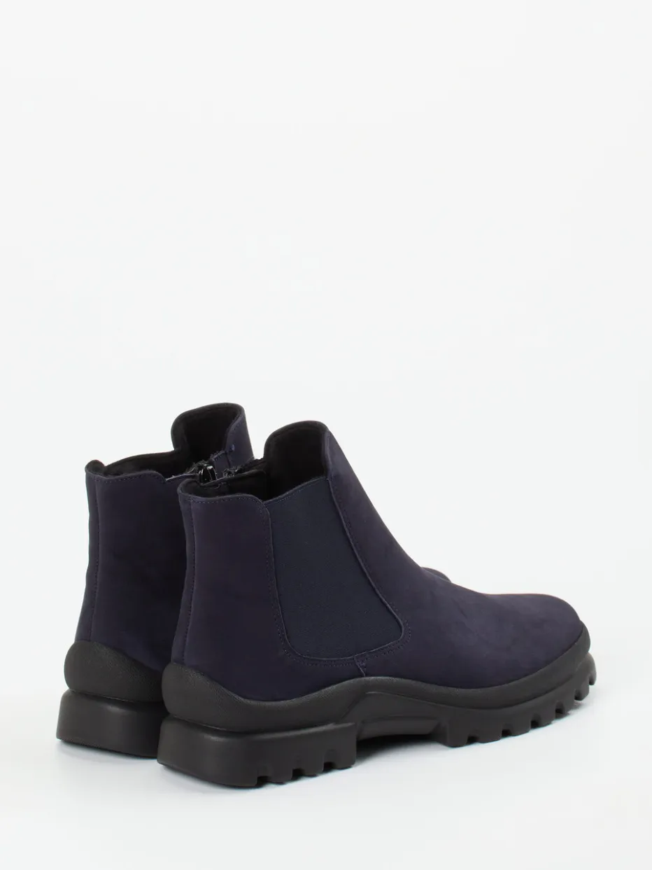 Stilsicher durch kühle Tage.Die Stiefelette von Semler vereint Komfort mit urbanem Minimalismus. Für nasses, kühles Wetter und lange Spaziergänge ist dieses Modell eine ideale Wahl. Gefertigt aus samtig angeschliffenem Nubukleder in Dunkelblau und mit mattem Finish, präsentieren sich die Chelsea Boots in einem klaren, klassischen Schnitt mit seitlichem Elastikeinsatz und praktischem Reißverschluss. Innen sorgt eine Mikrofaserfütterung mit Wechselfußbett für angenehmen Tragekomfort, während die luftgepolsterte PU-Sohle mit Profil guten Halt bietet. Modisch eingebettet in aktuelle Trends wie Quiet Utility und Lug Sole. Robuster Tragekomfort in funktionalem Design – typisch Semler.