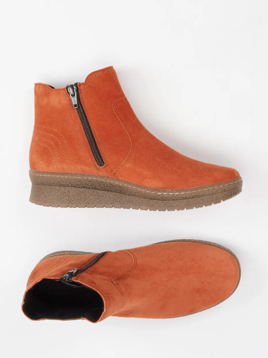 Ob beim Spaziergang durch buntes Laub oder im entspannten Cafébesuch – das samtig angeschliffene Veloursleder in sattem Ziegelrot verleiht dem Schuh eine warme, bodenständige Ausstrahlung. Feine Ton-in-Ton-Steppnähte sowie ein seitlicher Elastikeinsatz mit Struktur setzen dezente Akzente, während der innenliegende Reißverschluss müheloses An- und Ausziehen ermöglicht. Die profilierte Gummisohle mit Keilabsatz sorgt für ganztägigen Komfort. Im an Skandinavien angelehnten Look harmoniert das Modell wunderbar mit Strick in Naturtönen.