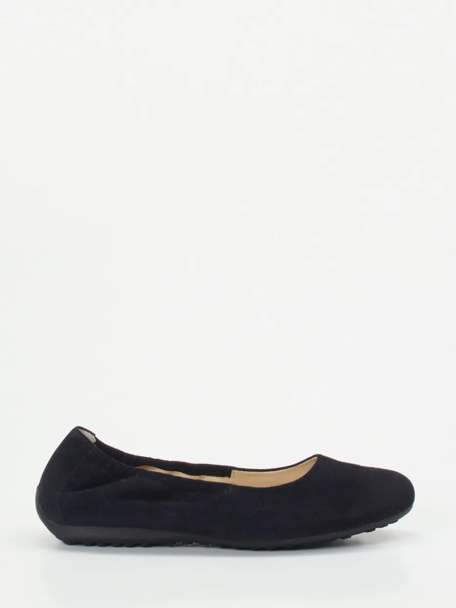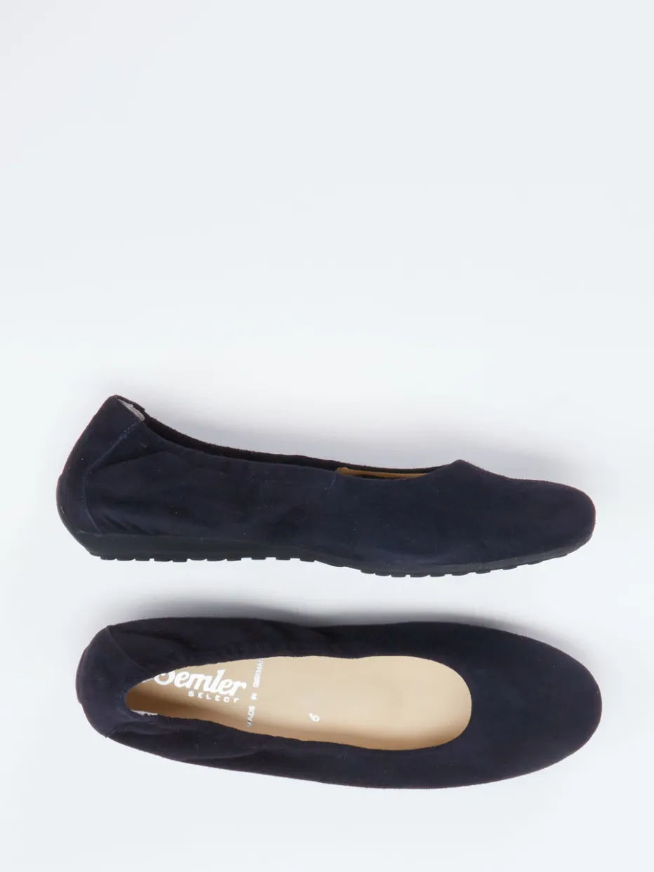 Komfort trifft minimalistisches Design.Diese Komfort-Ballerinas von Semler stehen für entspannte Eleganz in der Freizeit und zu Hause. Das samtig angeschliffene Veloursleder in tiefem Blau fügt sich harmonisch in puristische Looks ein. Die klassisch runde Form, kombiniert mit elastischem Einstieg und weich gepolsterter, herausnehmbarer Innensohle, verspricht höchsten Tragekomfort. Rutschhemmende Gummisohlen mit strukturierter Oberfläche runden das Design ebenso funktional wie stilvoll ab. Klare Linien und Ton-in-Ton-Nähte betonen die „Quiet Luxury“-Ästhetik und modernen Minimalismus. Ideal zu Stretch-Jeans oder feinen Strickteilen. Hebt Komfortbewusstsein auf markentypisches Qualitätsniveau.