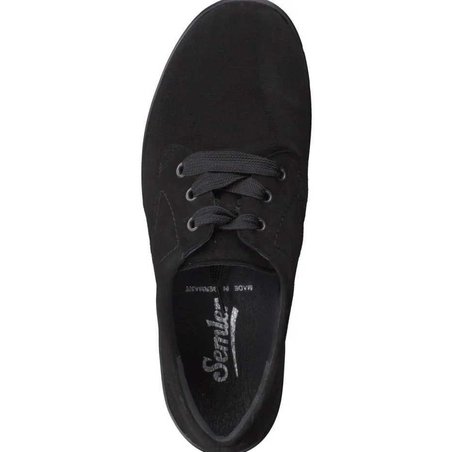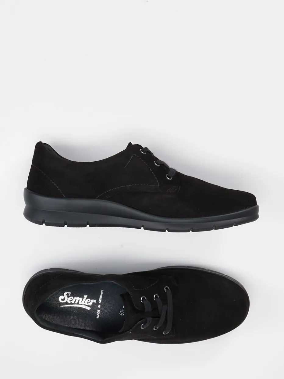 Minimalismus trifft Komfort.Semler präsentiert mit diesem Komfort-Halbschuh für Damen ein stilistisch reduziertes Modell in schwarzem Veloursleder. Die samtig-matte Oberfläche ergänzt sich mit einer Ton-in-Ton-Schnürung über Metallösen und einer klassischen, flachen Silhouette. Abgestimmt auf den täglichen Einsatz sorgt die leicht profilierte PU-Luftpolstersohle für sicheren Halt, während ein ergonomisches Vario-Fußbett höchsten Tragekomfort bietet. Der gepolsterte Einstieg und die weiche Weite H runden das funktionale Design ab. Perfekt kombinierbar mit schlichten Stoffhosen oder minimalistischer Geschäftsgarderobe. Komfortabel, zeitlos und mit gehobenem Finish – Semler-Qualität für anspruchsvolle Füße.