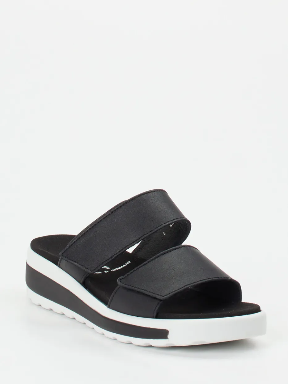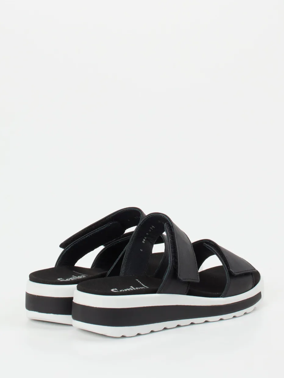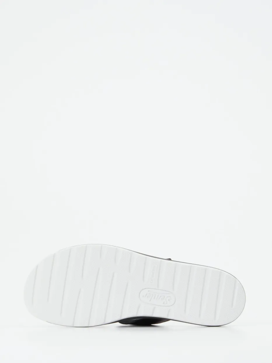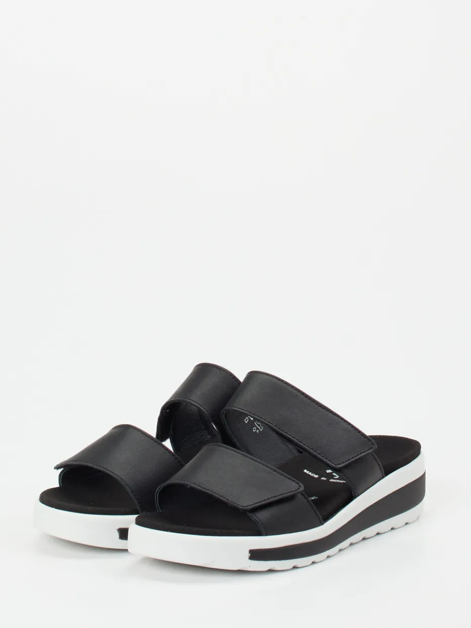 Ideal für entspannte Sommertage überzeugt sie mit ergonomischem Fußbett, weich gearbeitetem Kalbleder und komfortabler Weite H. Der schwarze Look wird durch eine weiße Kontrastsohle modisch akzentuiert, während zwei Klettverschlüsse für präzise Anpassung sorgen. Die offen ergonomisch geformte Silhouette sowie das rutschhemmende PU-Profil unterstreichen den funktionalen Anspruch dieses Modells. Ob zu Hause oder in der Freizeit – der minimalistische Stil trifft auf vielfach kombinierbaren Komfort.