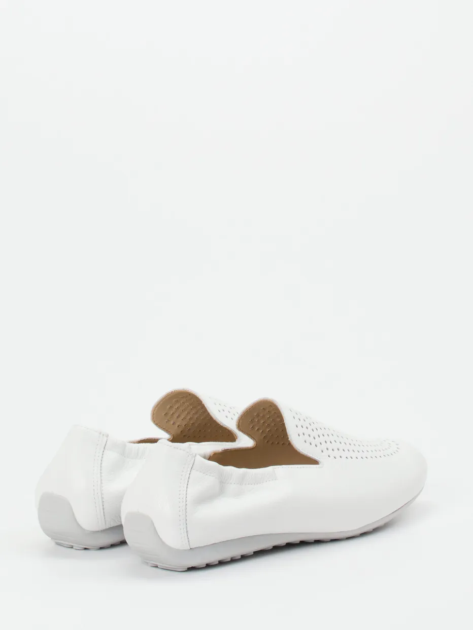 Dieser Komfort-Slipper aus weißem, genarbtem Kalbleder setzt auf Luftigkeit und Flexibilität – perfekt für entspannte Sommertage in stilvoller Zurückhaltung.