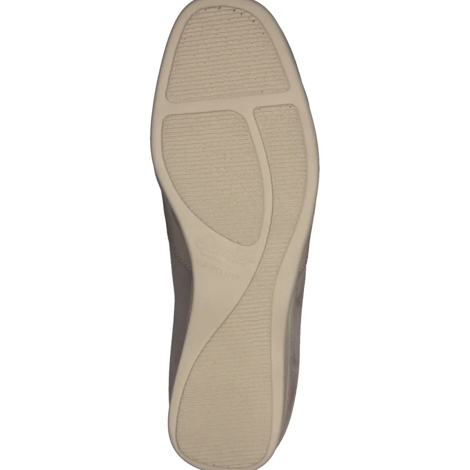 Dezenter Glanz für stilvolle Leichtigkeit.Der Komfort-Slipper von Semler verkörpert klassischen Chic mit funktionalen Details. Ideal für Alltag und Büro bietet er durch die Weite H und seine gepolsterte Innensohle angenehme Bewegungsfreiheit. Gefertigt aus leicht glänzendem Metallicleder harmoniert das beige-graue Finish mit dem tonalen Kreuzriemen am Spann. Die flache, luftgepolsterte PU-Sohle in Keilform unterstützt ein bequemes Laufgefühl. Der Schlüpfeinstieg mit Stretchanteil betont das komfortorientierte Design und lässt sich stilvoll zu Soft-Neutrals kombinieren. Semler vereint orthopädische Funktionalität mit dezenter Ästhetik – ideal für langes Tragen mit Anspruch.