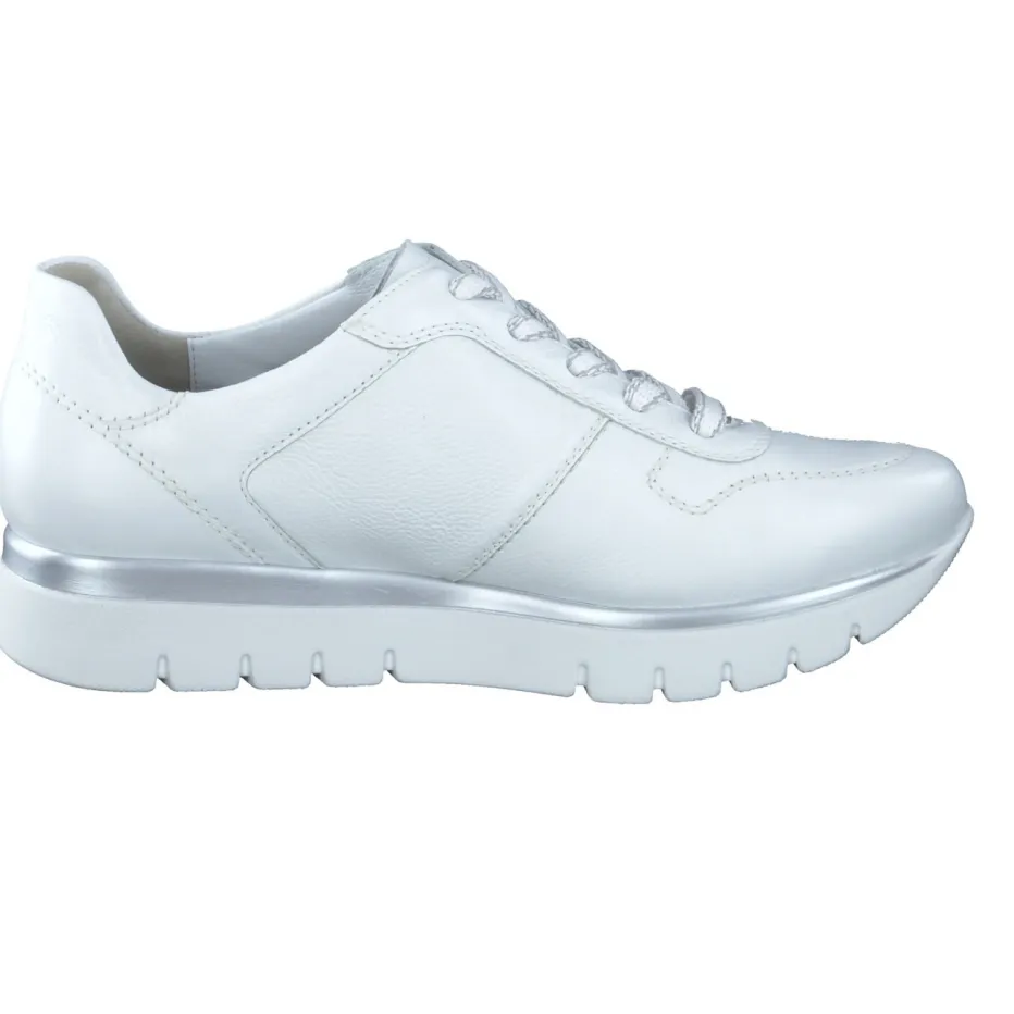 Ob beim Stadtbummel oder in entspannter Alltagsroutine – der Sneaker aus weißem Kalbleder mit matter Struktur und Offwhite-Nuance bietet angenehmen Halt. Die breite Schnürung sorgt für einfache Anpassung, während die gelenkschonende PU-Sohle mit silberfarbenem Rahmen optisch wie funktional Akzente setzt. Die Silhouette bleibt sportlich-klassisch mit betontem Schaftrand und gepolstertem Wechselfußbett. Ein Trend-Update liefern subtile Metallic-Details und Komfort-Technologie. Ideal zu pastellfarbenen Steppjacken oder hellen Lederaccessoires.