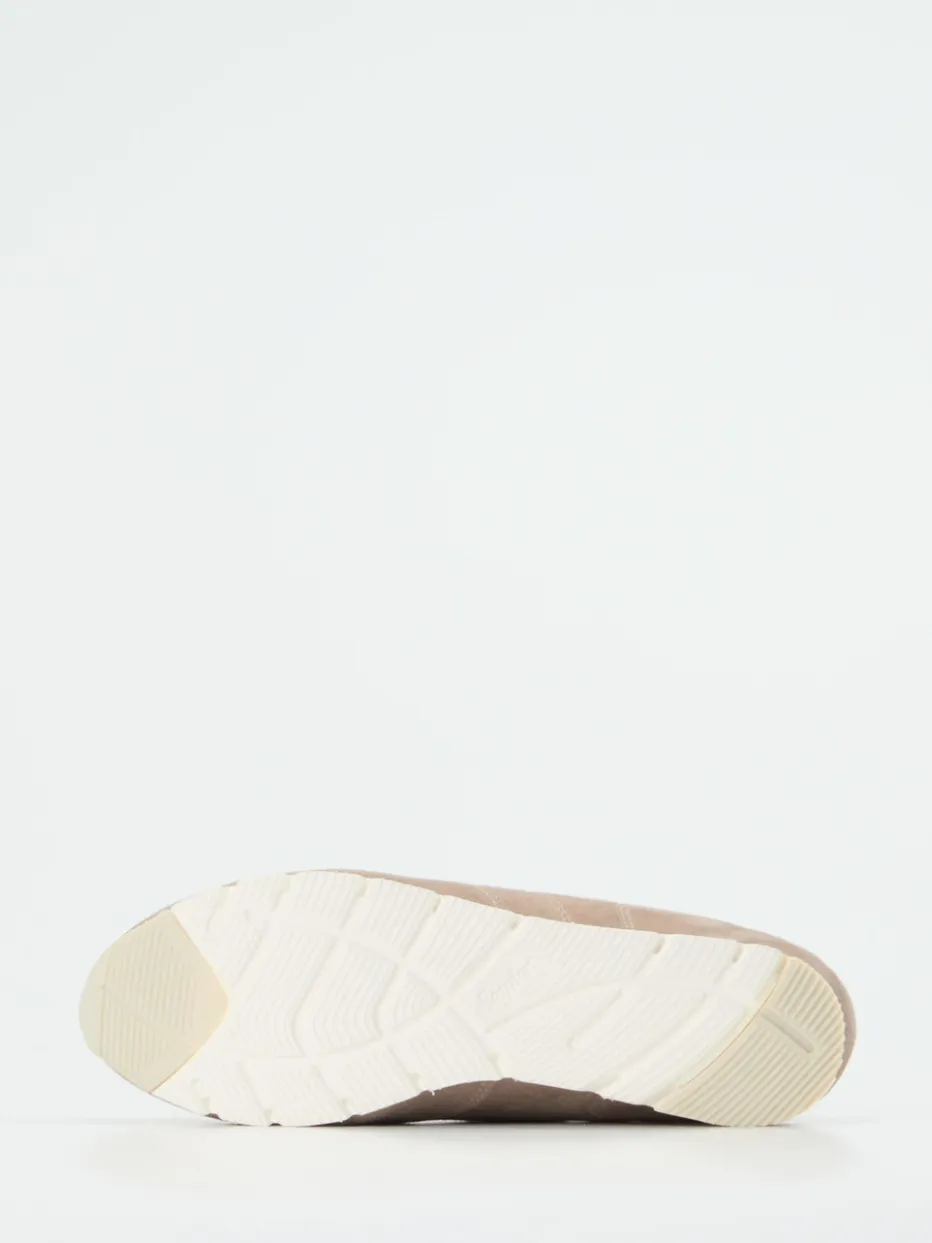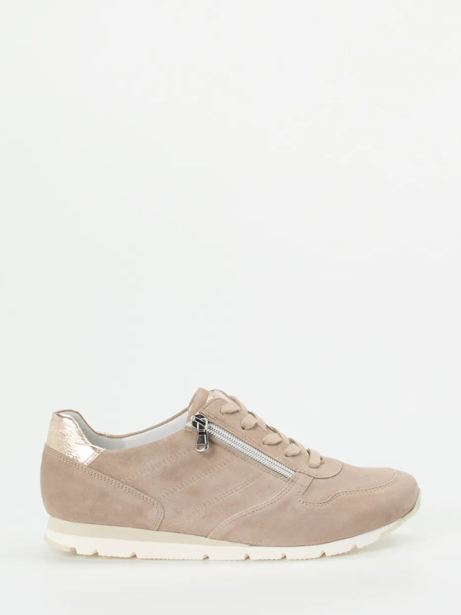 Stilvoller Komfort für jeden Tag.Die Marke Semler präsentiert mit diesem Damen-Sneaker ein gelungenes Modell aus der Kategorie Bequemschuh. Ideal für entspannte Freizeitmomente bietet der Sneaker eine Kombination aus beigefarbenem Veloursleder, samtig angeschliffen, und einem glänzenden Metallic-Patch in Rosé an Ferse und Lasche. Die flache Silhouette mit seitlichem Reißverschluss erleichtert das Anziehen; die tonige Schnürung ermöglicht individuelle Anpassung. Diagonal verlaufende Nähte setzen sportive Akzente, während die gummierte Profilsohle Alltagstauglichkeit verspricht. Dezente Metallic-Akzente greifen aktuelle Modetrends auf. Das lederbezogene Wechselfußbett rundet die hochwertige Ausstattung komfortorientiert ab.