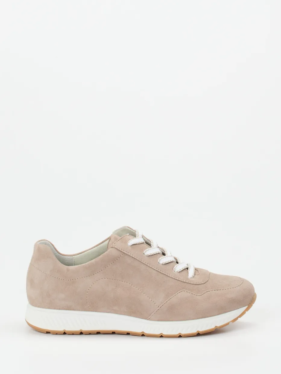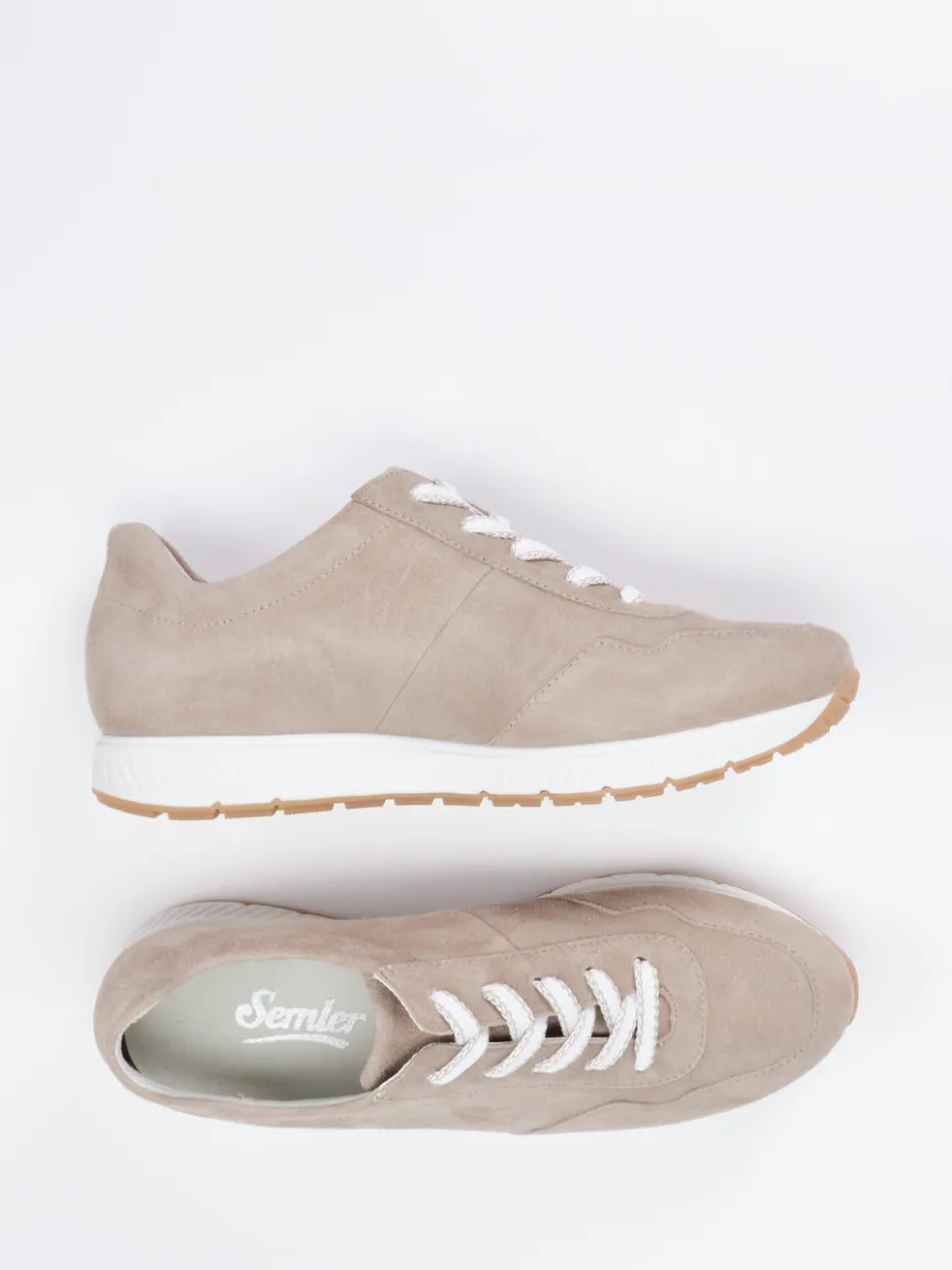 Unkompliziert stilvoll unterwegs.Der Damen-Sneaker von Semler verbindet durchdachten Komfort mit einem modernen, reduzierten Auftritt. Ideal für entspannte Tagesroutinen sorgt das beige Veloursleder mit samtig-matter Oberfläche für natürlichen Chic. Die klassisch-runde Silhouette trifft auf eine profilierte Gummisohle in Weiß-Honig-Kontrast, während die weiße Schnürung den minimalistischen Look unterstreicht. Dank H-Weite, herausnehmbarem Fußbett und gepolstertem Schaftrand eignet sich das Modell für Komfortbedürfnisse mit Anspruch. Trendstark im Soft-Neutrals-Stil, perfekt zu hellen Jogpants und casual Looks. Ein verlässlicher Alltagsbegleiter mit dem Fußgefühl von Semler.