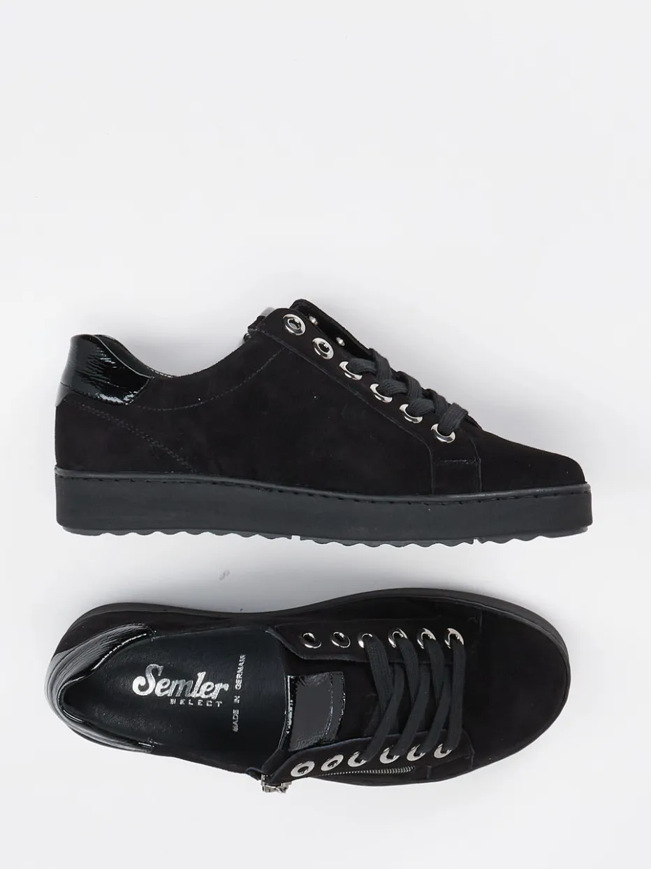 Moderner Materialmix für stilvolle Komforttage.Semler präsentiert einen komfortbetonten Damen-Sneaker, der Alltagstauglichkeit mit dezenten Design-Statements verbindet. Für entspannte Alltagswege bietet das Modell Rebecca in Weite H ideale Voraussetzungen. Schwarzes Veloursleder mit samtiger Haptik trifft auf glänzende Lackleder-Akzente an Ferse und Lasche sowie metallische Ösen. Die Kombination aus Schnürung und seitlichem Reißverschluss erleichtert das Handling. Die profilierte Luftpolstersohle aus PU sorgt für Leichtigkeit und Dämpfung. Visuell orientiert sich das Design an der „Quiet Luxury“-Ästhetik der Saison. Ein flexibler Favorit für Casual-Styles mit funktionalem Anspruch – typisch Semler.