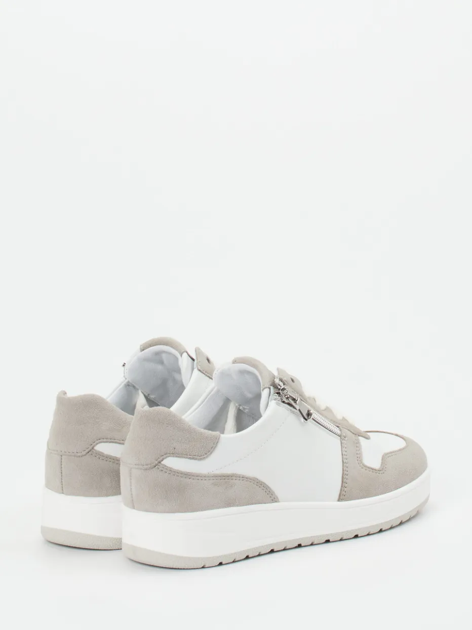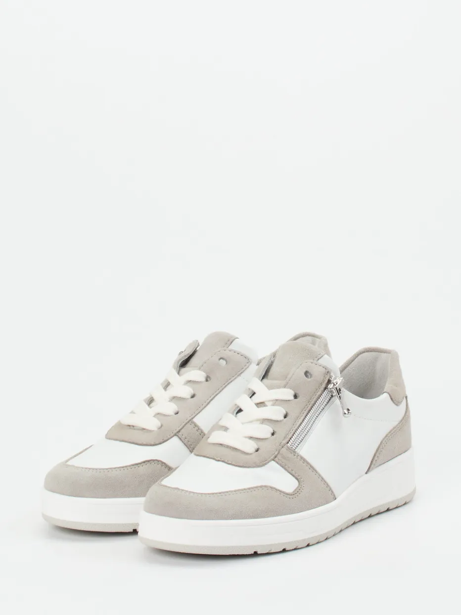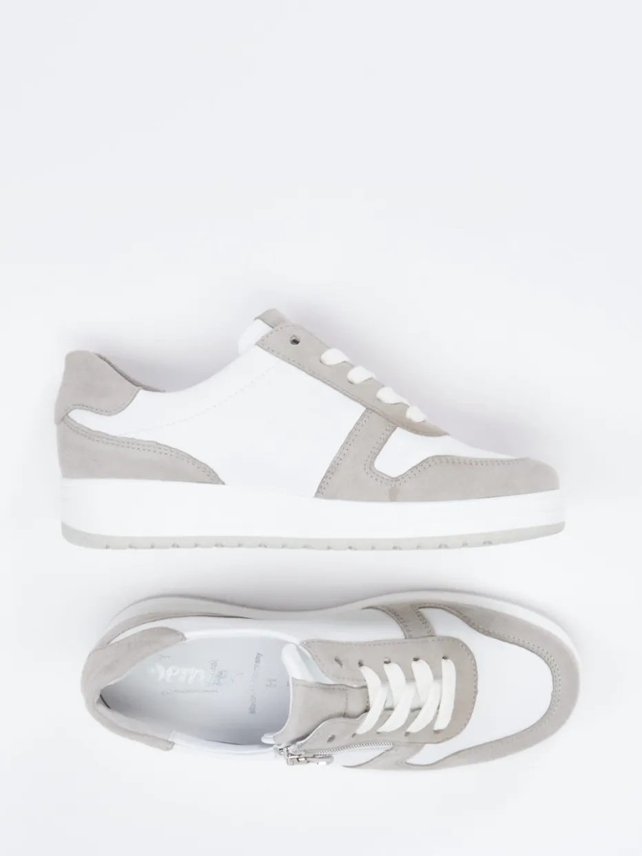 Komfort trifft sportliche Leichtigkeit.Semler präsentiert mit diesem Komfort-Sneaker ein Modell aus der Linie Verona, gefertigt in Weite H. Für entspannte Stadtspaziergänge oder den Alltag im Büro bietet dieser Damenschuh hervorragenden Tragekomfort. Das hochwertige Materialmix aus samtig angeschliffenem Veloursleder und weißem Kalbleder zeigt sich in einem dezenten Grau-Weiß-Kontrast. Die klassische Rundform mit tonaler Schnürung und praktischem Reißverschluss erleichtert das An- und Ausziehen. Optisch modern durch sportlich neutrale Silhouette, liegt der Schuh im Trendthema Soft Neutrals SS24. Die profilierte Gummisohle und das auswechselbare Fußbett ergänzen die funktionale Ausstattung. Die markentypische Verbindung aus Qualität und Wohlfühlpassform definiert diesen Look.