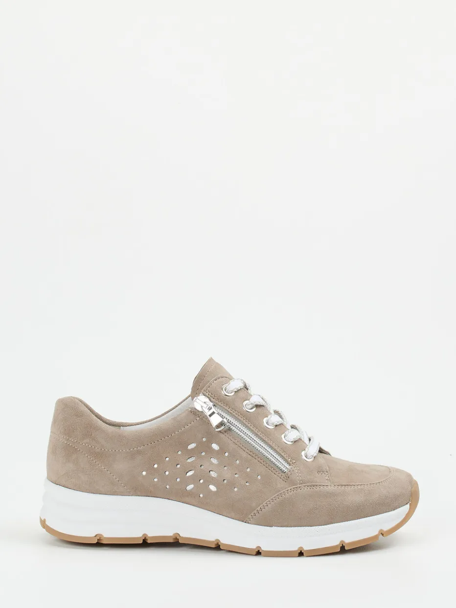 Smarte Leichtigkeit für jeden Tag.Semler präsentiert mit diesem Komfort-Sneaker für Damen ein Modell, das Alltag und Entspannung stilvoll verbindet. Ob beim Stadtbummel oder im Homeoffice – das beigefarbene Veloursleder überzeugt durch samtige Haptik, ergänzt durch luftige Perforationen und eine matt gehaltene Oberfläche. Ein seitlicher Reißverschluss ermöglicht bequemes An- und Ausziehen. Die profilierte Gummisohle mit Luftpolsterung bietet Stabilität und sanfte Dämpfung. Dank herausnehmbarem, lederbezogenem Korkfußbett eignet sich der Schuh auch für eigene Einlagen. Dezente Farbakzente in Weiß und Hellbraun greifen den Soft-Neutrals-Trend auf. Komfort in zeitgemäßem Design – made by Semler.