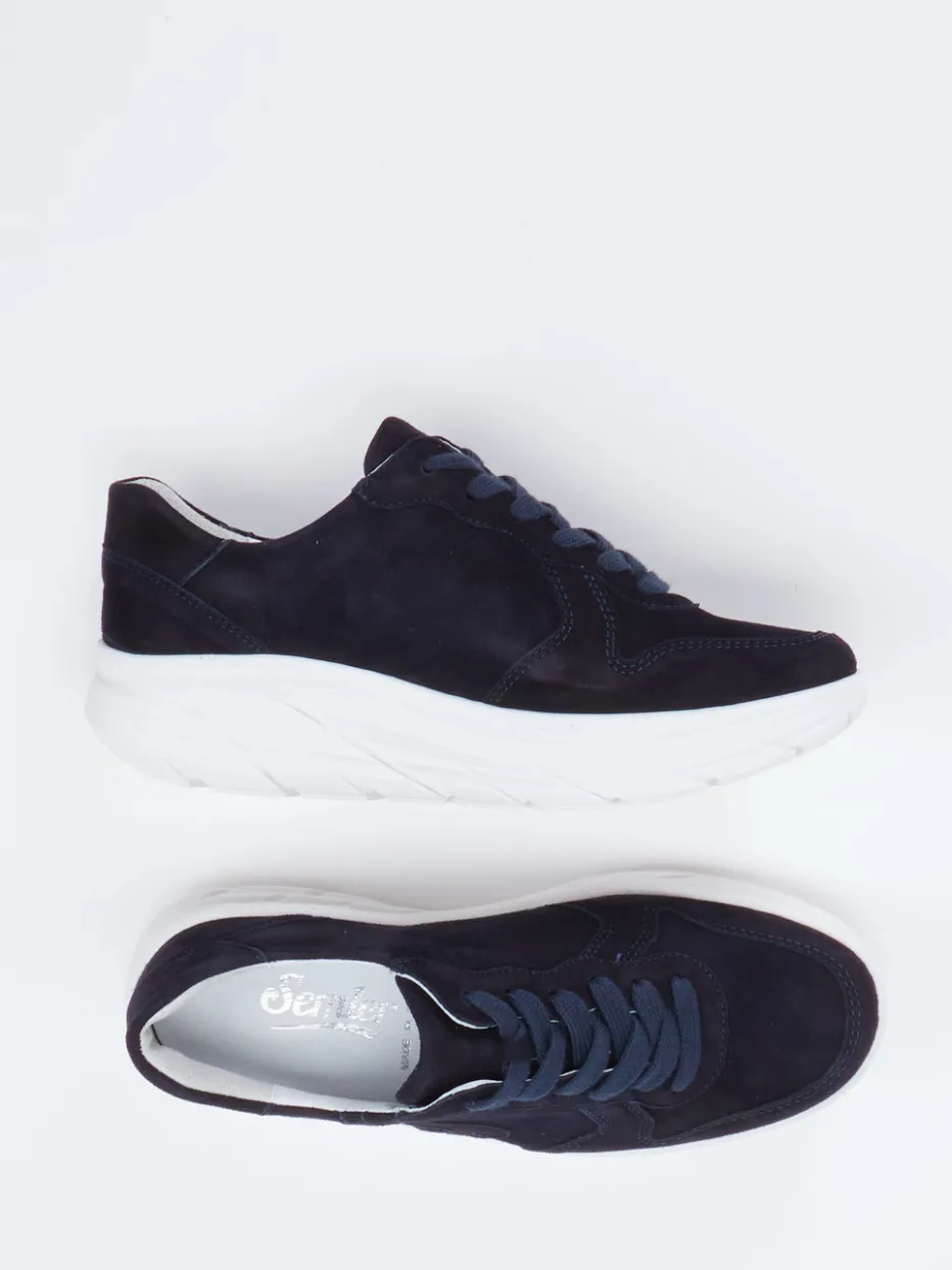 Mit Stil und Komfort durch den Tag.Der Komfort-Sneaker von Semler kombiniert modisches Understatement mit ergonomischem Design. Ideal für entspannte Freizeitaktivitäten oder den Alltag in Bewegung: Das mitternachtsblaue Veloursleder präsentiert sich samtig-matt und wird durch weiße Kontraste an Schnürung und Sohle akzentuiert. Seine low-top-Silhouette, die profilierte Laufsohle und der gepolsterte Einstieg sorgen für ein angenehmes Laufgefühl, unterstützt durch das austauschbare Fußbett und die bequeme Weite H. Minimalistische Ton-in-Ton-Nähte runden das moderne Design ab. Funktion trifft hier auf Streetwear-inspirierten Casual-Charme. Komfort und klare Linienführung – ein typisch durchdachtes Design von Semler.