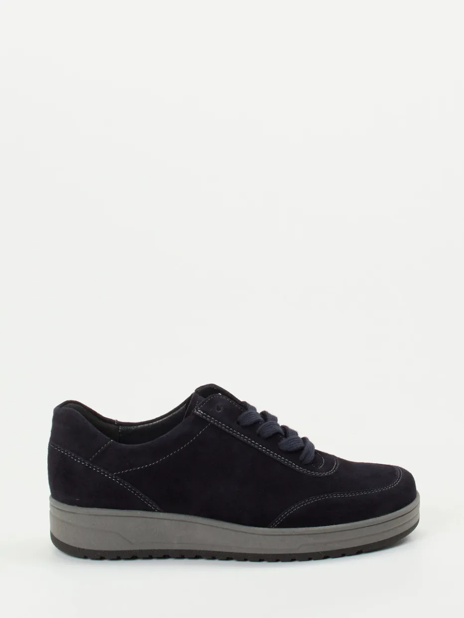 Dank samtig angeschliffenem Veloursleder in sattem Dunkelblau wirkt der Schuh klar und hochwertig. Die gerundete Form mit hellgrauen Kontrastnähten und weich gepolstertem Schaftrand unterstreicht das dezente Komfortdesign, ergänzt durch die profilierte Gummisohle in Grau. Die Weite H, das auswechselbare Fußbett und die funktionale Schnürung bieten Tragekomfort auf individuellem Niveau. Im Trend „Quiet Luxury“ lässt sich der Sneaker hervorragend zu Steppweste und Stretch-Jeans stylen.