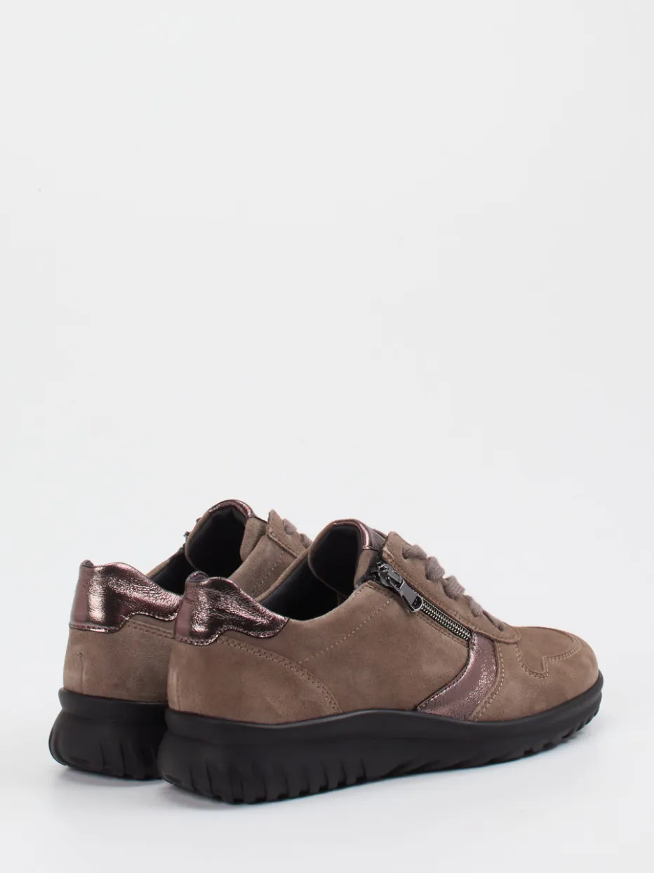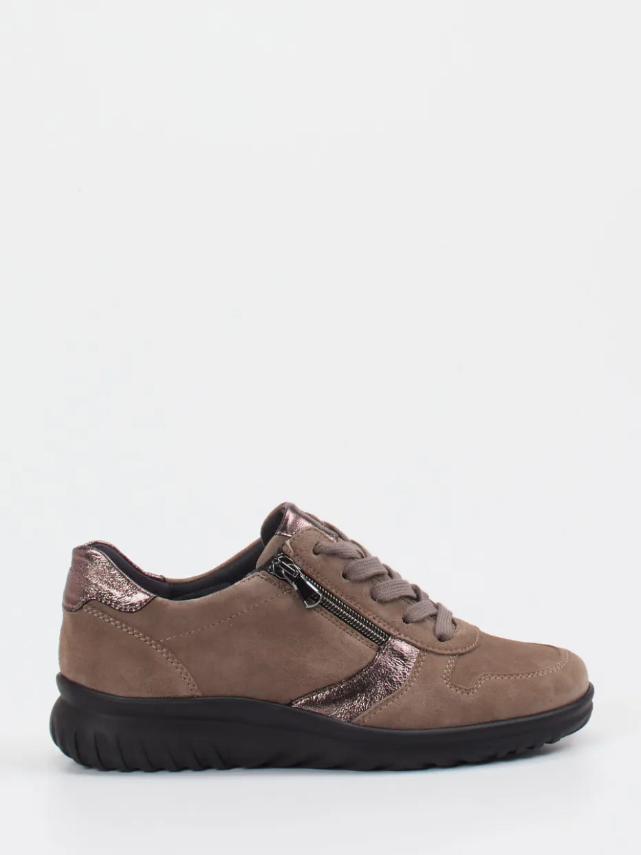 Komfort trifft auf stilvolle Details.Semler präsentiert einen Damen-Komfort-Sneaker, der Alltagstauglichkeit mit modernem Design verbindet. Für entspannte Spaziergänge oder lange Tage unterwegs überzeugt das Modell mit weichem Veloursleder, dessen Oberfläche samtig angeschliffen ist. Das taupefarbene Obermaterial wird durch dezente Bronzémetallic-Einsätze akzentuiert, ergänzt von tonigen Nähten und einer klassischen, abgerundeten Silhouette. Ein seitlicher Reißverschluss erleichtert den Einstieg, während die PU-Sohle mit dezenter Profilierung bequem und zuverlässig führt. Die trendtypischen Metallic-Akzente machen ihn zu einem stilvollen Allrounder für die herbstliche Casual-Garderobe. Semler vereint fühlbaren Komfort mit feinsinnigem Stilverständnis.