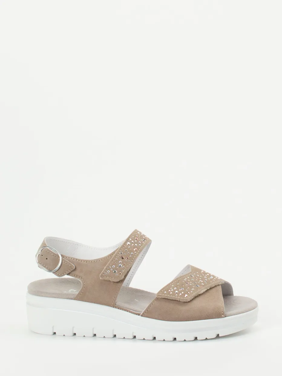Eleganter Komfort für den Sommer.Die Marke Semler präsentiert mit dieser Komfortsandale ein ebenso funktionales wie stilvolles Modell für Damen. Für entspannte Spaziergänge und lange Sommertage im Freien bietet das weich gepolsterte Fußbett mit komfortabler Weite H eine ausgezeichnete Basis. Gefertigt aus samtigem Veloursleder in Beigebraun überzeugt die Sandale mit verstellbaren Riemen, funkelndem Schmucksteinbesatz und heller, profilierter Luftpolstersohle mit dezentem Kontrastrand. Der praktische Klettverschluss und die Schnalle mit Druckknopf garantieren optimalen Halt und einfaches Handling. Minimalistisches Design trifft auf modische Glitzerakzente – passend zum Sommertrend 2024. Semler steht für hochwertige Materialien und durchdachten Tragekomfort mit Alltagstauglichkeit.
