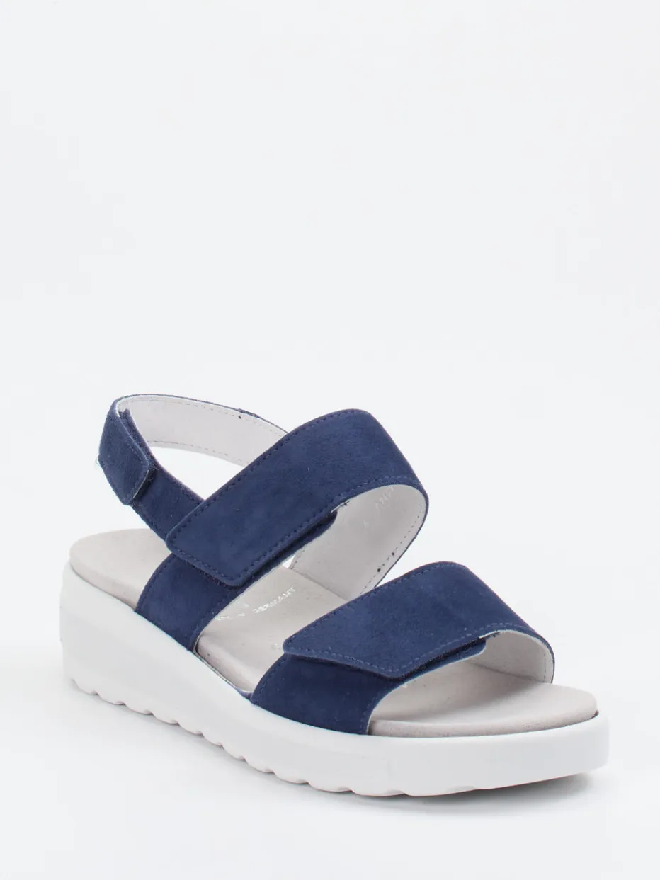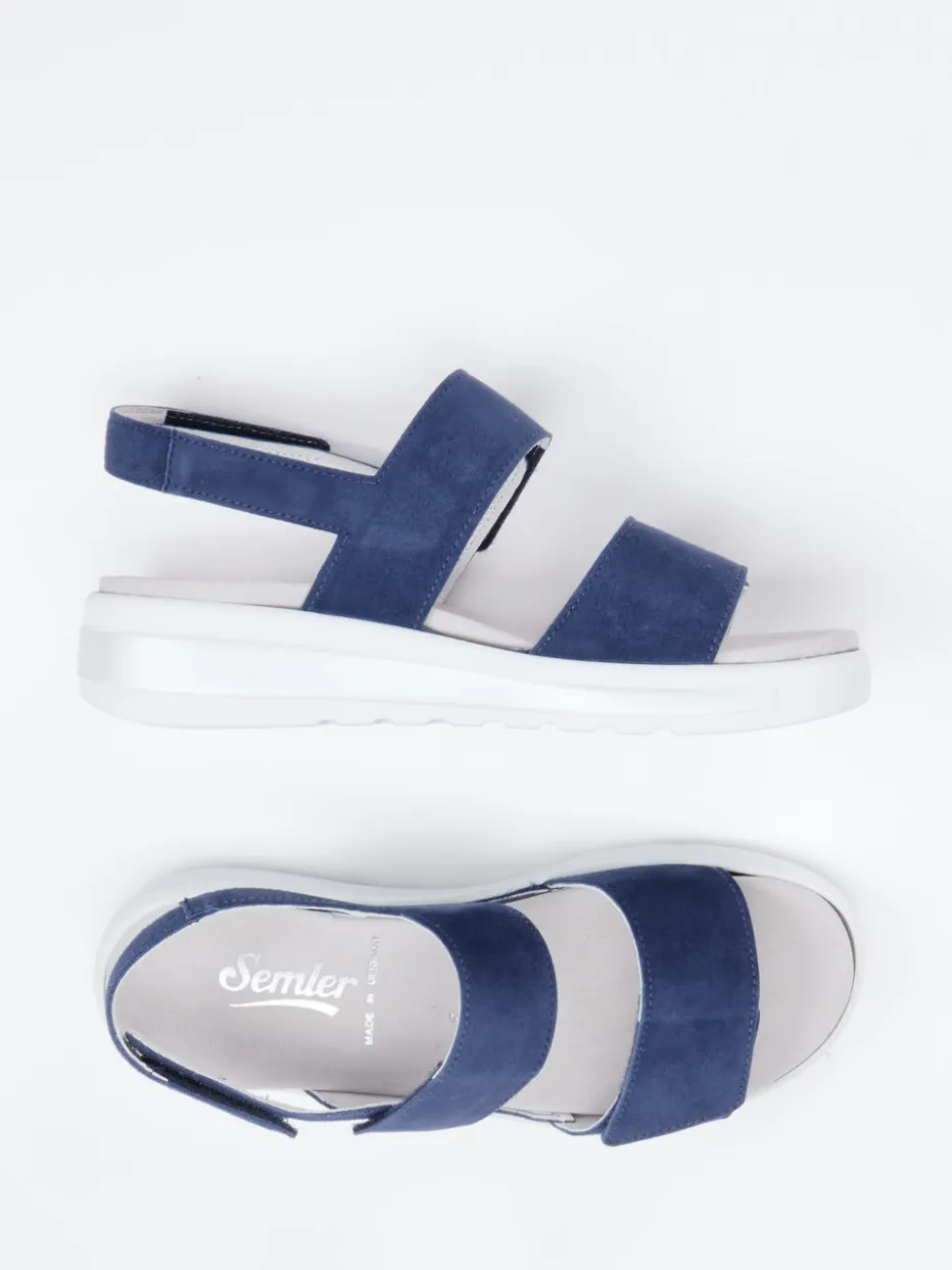 Alltagstauglich mit Wohlfühlfaktor.Die Marke Semler präsentiert diese komfortbetonte Sandale für Damen. Ideal für entspannte Tagestouren und den Alltag zuhause: Das marineblaue Veloursleder mit seiner matt-weichen Haptik unterstreicht das reduzierte Design. Zwei breite Klettverschlüsse und ein Fersenriemen mit Klett bieten Anpassungsfreiheit und Stabilität. Das ledergefütterte Fußbett ist weich gepolstert und bei Bedarf austauschbar. Die luftgepolsterte PU-Sohle mit leichter Keilform sorgt für rutschfesten Halt. Ein moderner Komfortschuh mit dezentem Minimalismus – typisch Semler.