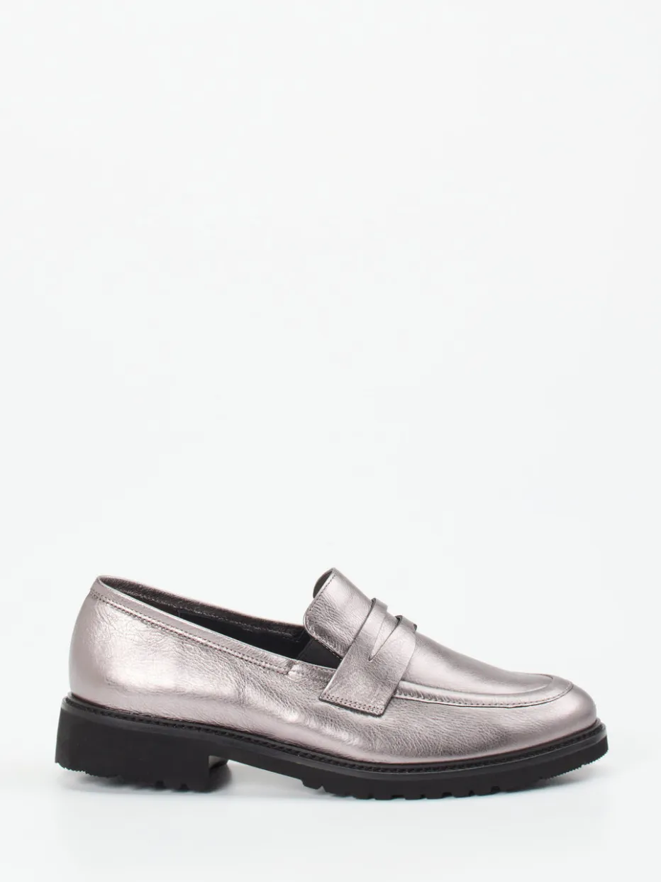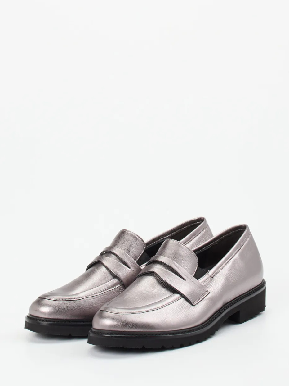Stilvolle Zurückhaltung mit Glanzeffekt.Die Marke Semler präsentiert hier einen Damen-Loafer im Trotteur-Stil. Ideal für lange Bürotage oder stilvolle Freizeitlooks: Das silberfarbene Metallicleder verleiht dem Schuh einen zeitgemäßen Glanz, ohne aufdringlich zu wirken. Die klassische Silhouette mit Zunge und zartem Riegel unterstreicht den minimalistischen Charakter. Ton-in-Ton-Nähte und das glänzende Finish akzentuieren das edle Design. Die profilierte, schwarze Gummisohle sorgt für Rutschsicherheit, ein Wechselfußbett erhöht die Alltagstauglichkeit. Der Schuh lässt sich ideal mit monochromen Stoffhosen oder Business-Röcken kombinieren. Semler steht für stilbewusste Bequemlichkeit gepaart mit modernen Designimpulsen.
