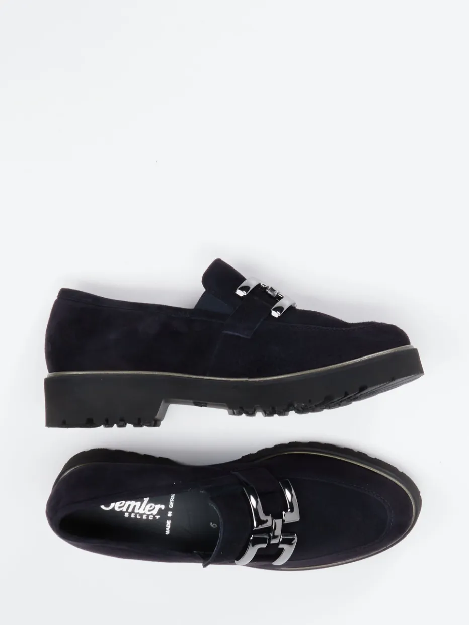 Minimalistischer Chic für jeden Tag.Semler präsentiert einen stilvollen Damen-Loafer mit flacher Silhouette in tiefdunkelblauem Veloursleder. Für Büroalltag oder gepflegte City-Looks bietet dieser Trotteur mit angenehm weichem Leder, silberfarbener Zierschnalle und dezenter Nahtführung eine perfekte Balance aus Eleganz und Alltagstauglichkeit. Die markante Gummisohle mit starkem Profil sorgt für sicheren Halt, während das gepolsterte, austauschbare Fußbett zusätzlichen Komfort bietet. Der Schlupfschuh lässt sich unkompliziert kombinieren – besonders zu Jeans oder schmalen Stoffhosen ein Blickfang. Die Einflüsse von „Quiet Luxury“ und „Classic Revival“ machen ihn ausgesprochen zeitgemäß. Komfort und Stil – vereint in semlerscher Qualität.