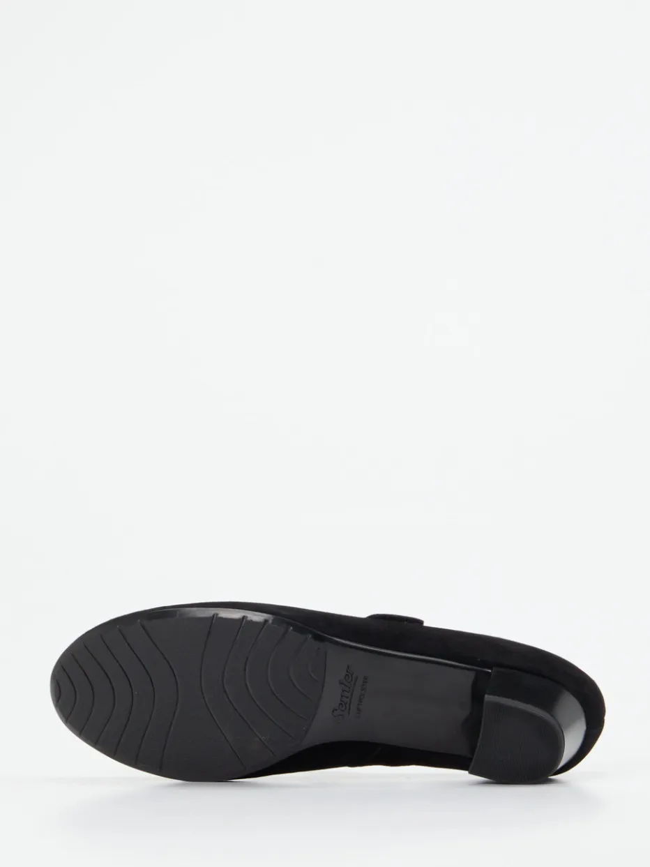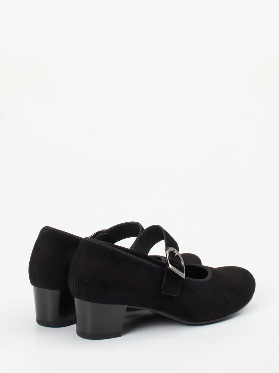 Die Marke Semler präsentiert klassische Mary Jane Pumps in schwarzem Veloursleder. Dieses Modell überzeugt durch klare Linien, hochwertigen Tragekomfort und dezente Raffinesse.