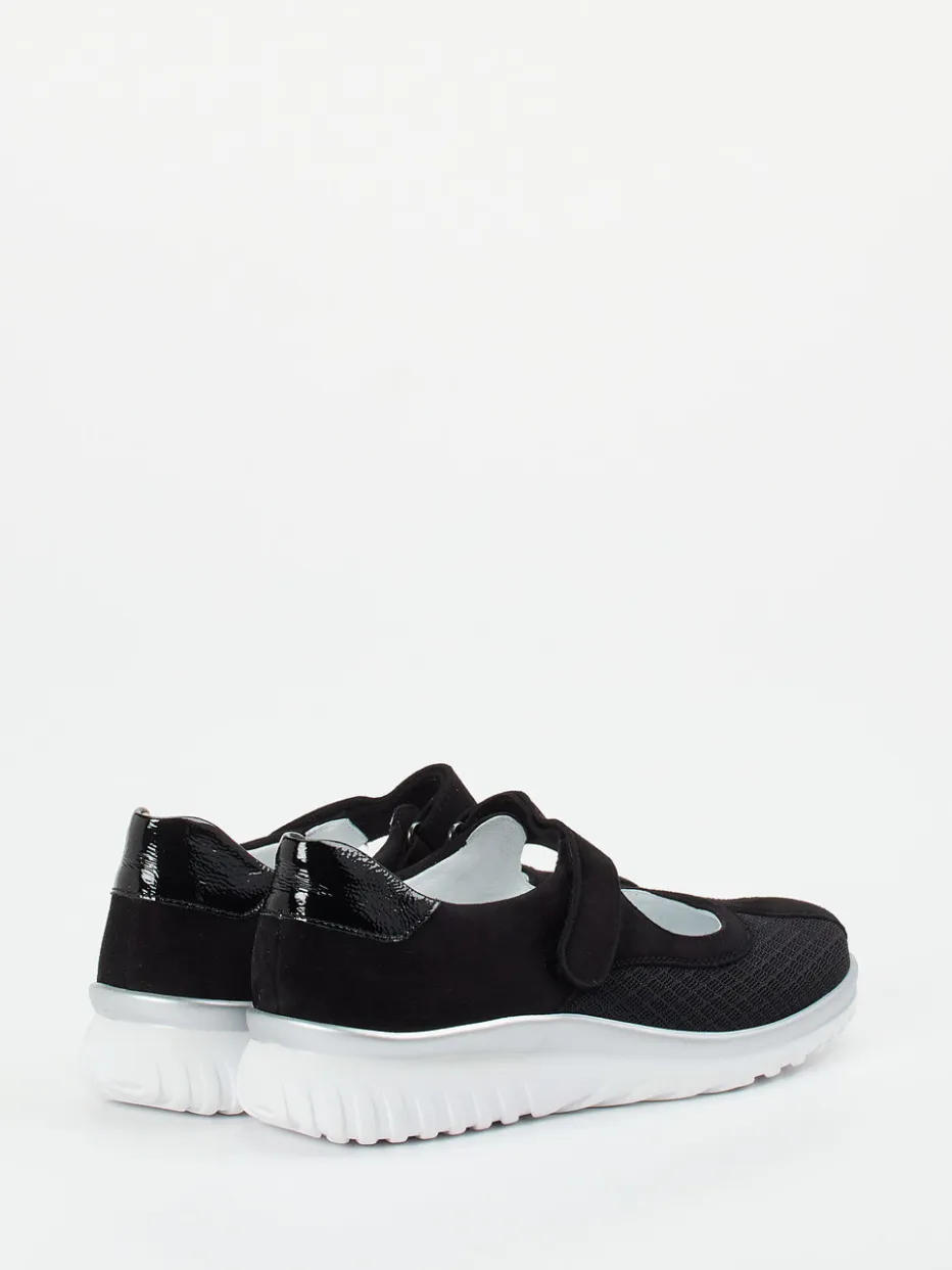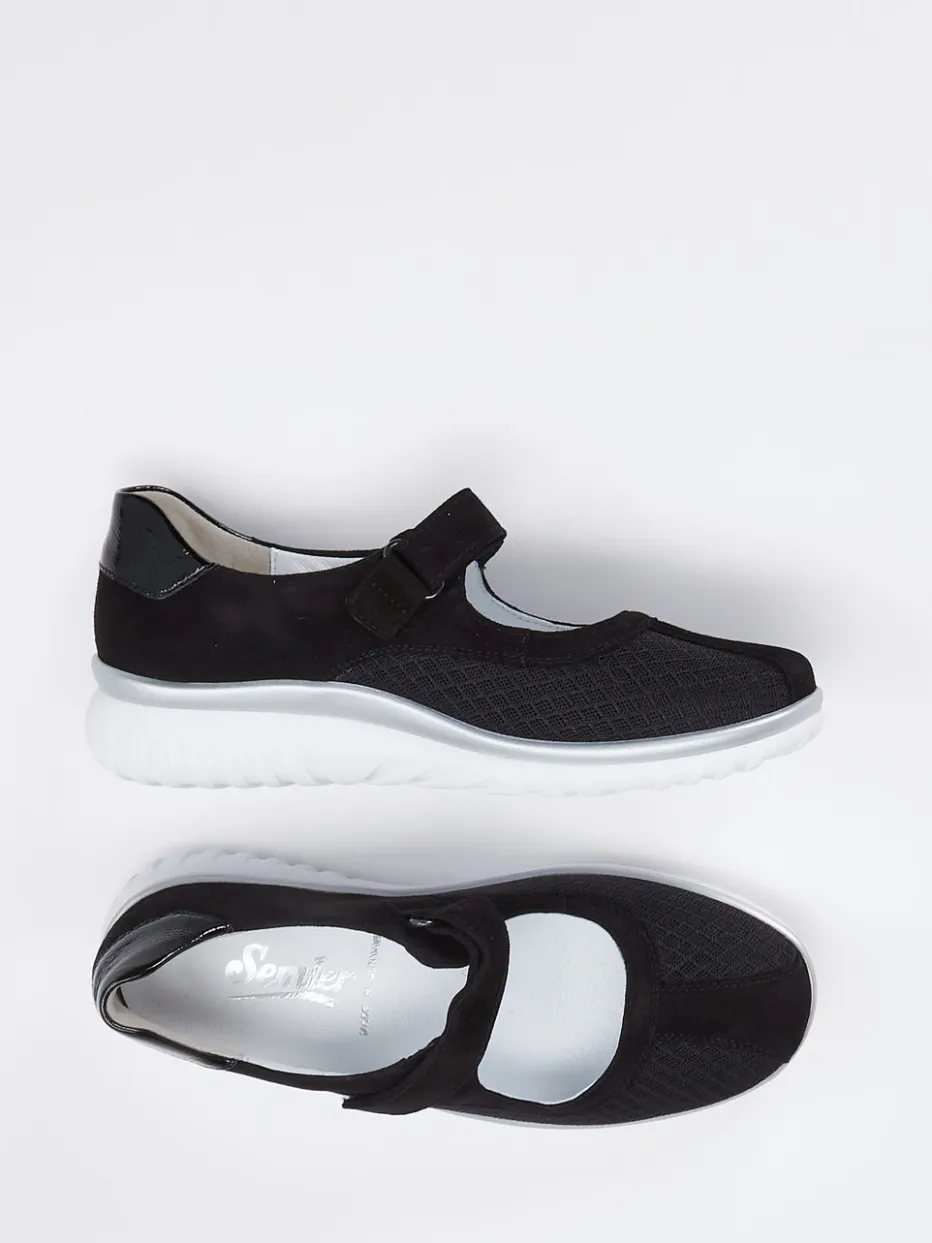 Sportlich-bequemer Auftritt in Schwarz.Semler interpretiert den klassischen Mary Jane in sportlich-moderner Form. Diese Damen-Halbschuhe mit Klettverschluss bieten ergonomischen Komfort für vielseitige Alltagseinsätze. Das Obermaterial aus samtig angeschliffenem Veloursleder wird durch Mesh-Zonen mit dezenter Struktur ergänzt, was dem Schuh eine luftige Leichtigkeit verleiht. Die schwarze Farbgebung wird durch weiße und silberne Akzente an der besonders leichten PU-Luftpolstersohle spannend akzentuiert. Die verstärkte Fersenkappe mit glänzender Lacknote sowie die rund ergonomische Silhouette unterstreichen den sportlich-relaxeden Stil. Ideal für Freizeit und Relax-Momente daheim – auch mit orthopädischen Einlagen tragbar. Semler-typischer Komfort trifft auf moderne Athleisure-Ästhetik.