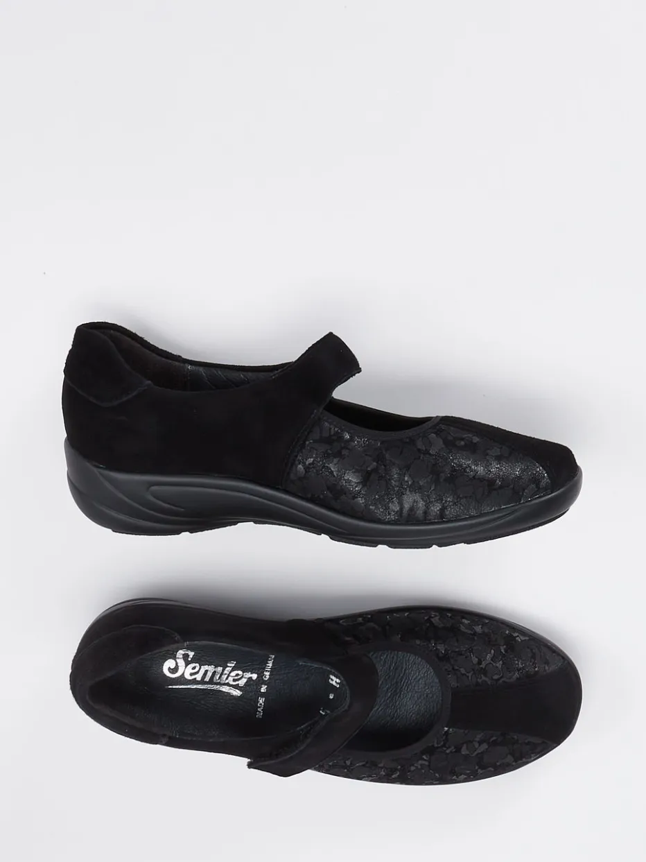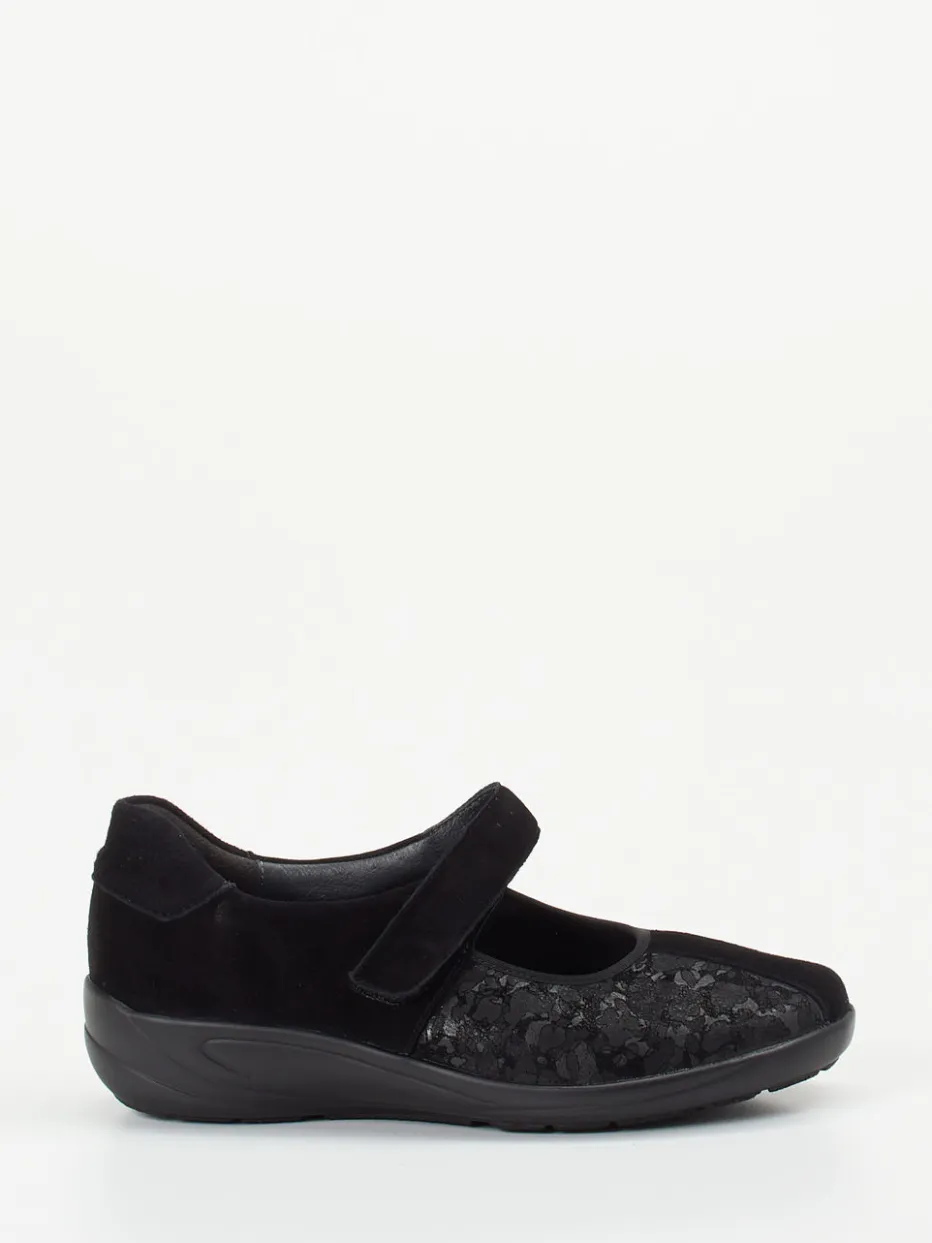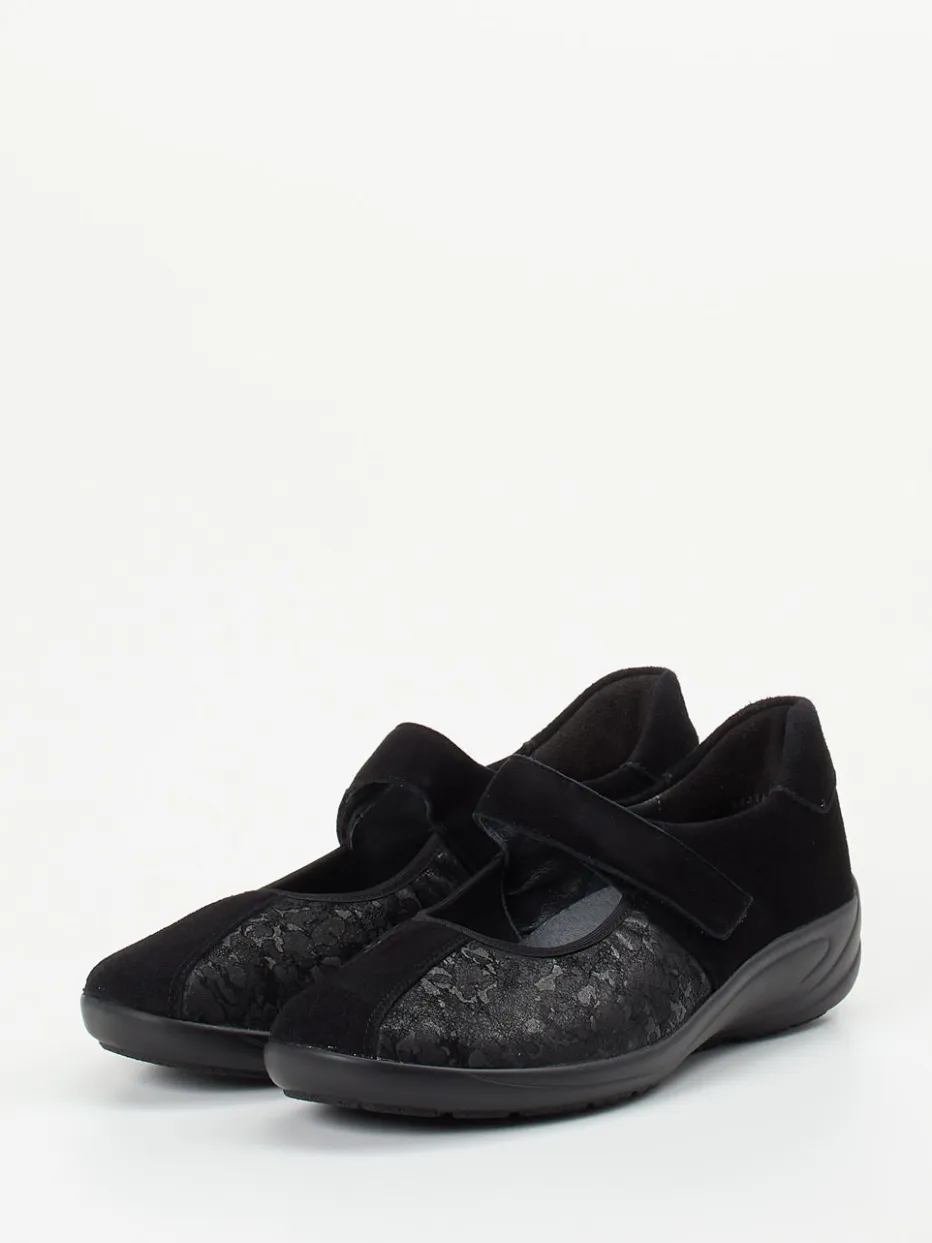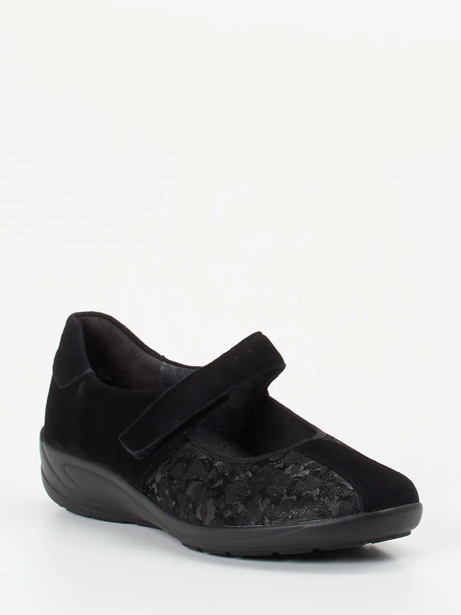 Komfort trifft florale Prägung.Semler zeigt mit diesen Mary Janes eine feminine Komfortlösung für den Alltag. Für langes Gehen oder entspannte Stunden zu Hause: Das Modell überzeugt mit flexiblem Stretchmaterial, das durch eine matte florale Prägung auf dem Vorderblatt akzentuiert wird. In klassischem Schwarz gehalten, unterstützt die runde, ergonomische Form gemeinsam mit dem gepolsterten Fersenbereich und der PU-Luftpolstersohle ein gelenkschonendes Laufgefühl. Der Klettriemen sorgt für individuelle Passform, das herausnehmbare Fußbett erlaubt den Einsatz eigener Einlagen. Retro-inspirierte Funktionalität trifft hier auf den „Comfort First“-Trend. Ein bequemer Freizeitbegleiter mit ausgewogener Semler-Passform und dezenter Eleganz.