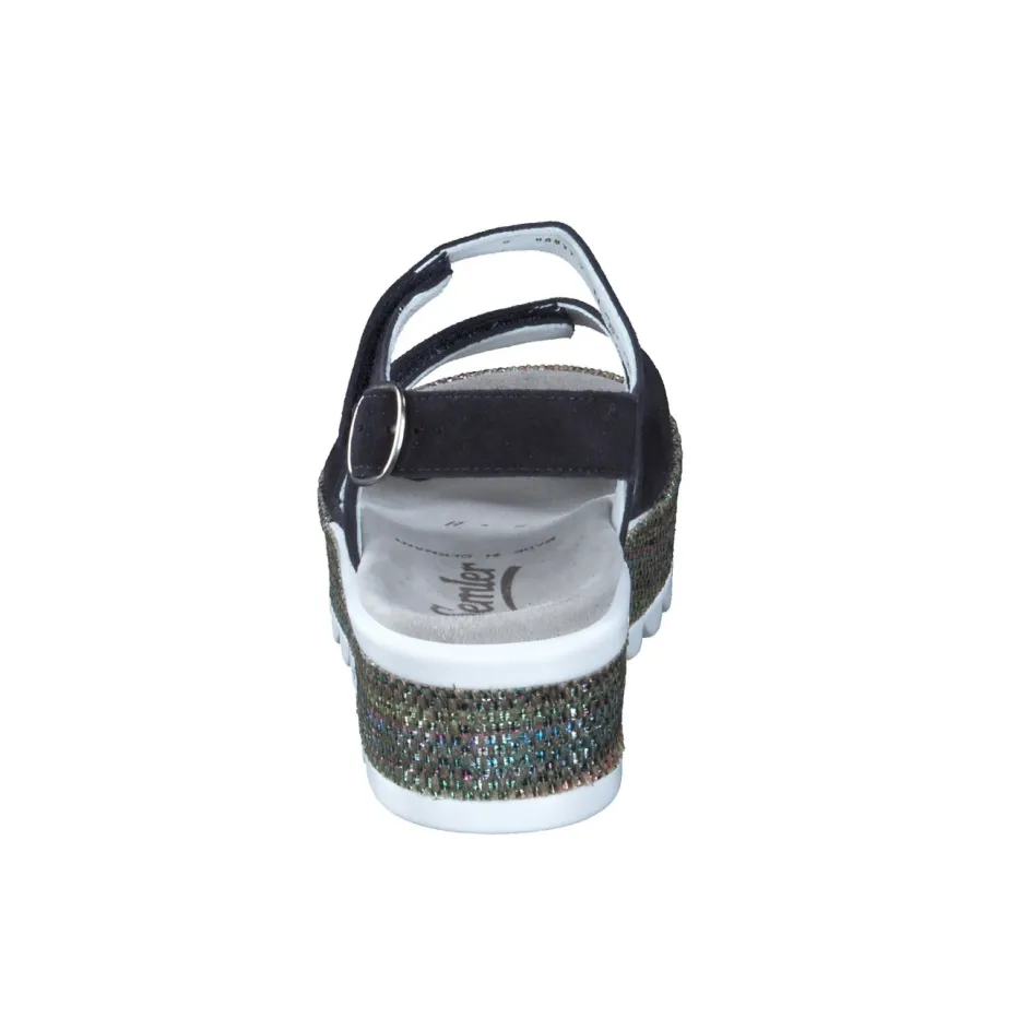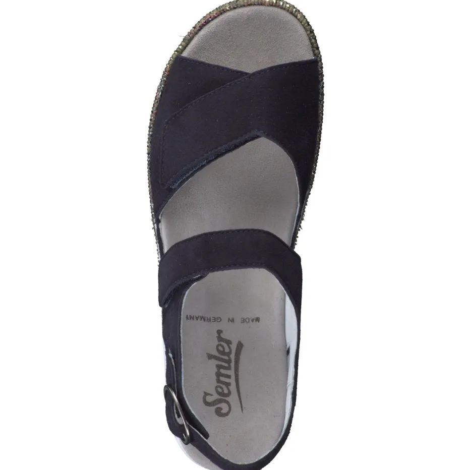 Modischer Komfort auf neuem Niveau.Semler präsentiert eine stilvolle Damen-Plateau-Sandale für Alltag und Urlaub. Die Sandale überzeugt mit einem weichen, dunkelblauen Veloursleder, samtig angeschliffen und ergänzt durch textile Glitzerelemente am mehrfarbigen Plateau. Breite Riemen mit Klettverschlüssen und einer silberfarbenen Metallschließe sorgen für individuelle Passform. Das anatomische, mit Leder bezogene Fußbett ist austauschbar und die weiß profilierte PU-Sohle bietet stabilen Halt. Inspiriert von modernen Metallic-Akzenten passt das Modell ideal zu entspannten Casual-Looks und leichten Sommeroutfits. Semler steht hier für maximalen Komfort mit modischem Feinschliff.