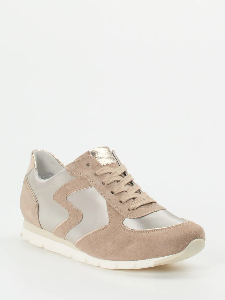 Ideal für entspannte Freizeitaktivitäten überzeugt das Modell durch beigefarbenes Veloursleder, ergänzt um satinartiges Textil und schimmernde Metallicdetails an Lasche und Ferse. Die flache, sportliche Silhouette mit breiter Schnürung und gepolstertem Schaftrand sorgt für Tragekomfort sowie sicheren Halt. Farblich bleibt der Look in Beige, Offwhite und Silber dezent und vielseitig. Die griffige Gummisohle unterstreicht den Alltagstauglichen Charakter. Ob zu Jogpants oder Strick – der Sneaker passt in jede moderne Capsule Wardrobe.