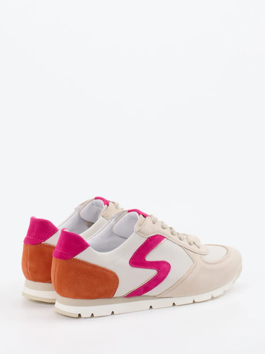Kontrastreiches Design mit Retro-Charme.Semler präsentiert einen Damen-Sneaker im angesagten Retro-Runner-Stil. Ideal für urbane Freizeitmomente und sommerliche Erkundungstouren: Das Modell kombiniert hochwertiges Velour/Leder mit einer samtig-matten Oberfläche. In Beige gehalten und aufgefrischt durch dynamische Farbdetails in Pink und Rostorange sowie ein Z-förmiges Seitenelement, zeigt sich die klassische flache Silhouette äußerst modern. Polsterungen am Einstieg und ein durchgehendes Schnürsystem stehen für Tragekomfort. Die profilierte Gummisohle sorgt für sicheren Halt. Color-Blocking und 90s-Ästhetik machen ihn zum passenden Statement für lässige Streetwear. Bequemer Sneaker mit stilprägender Retro-Note – Semler-typisch hochwertig umgesetzt.