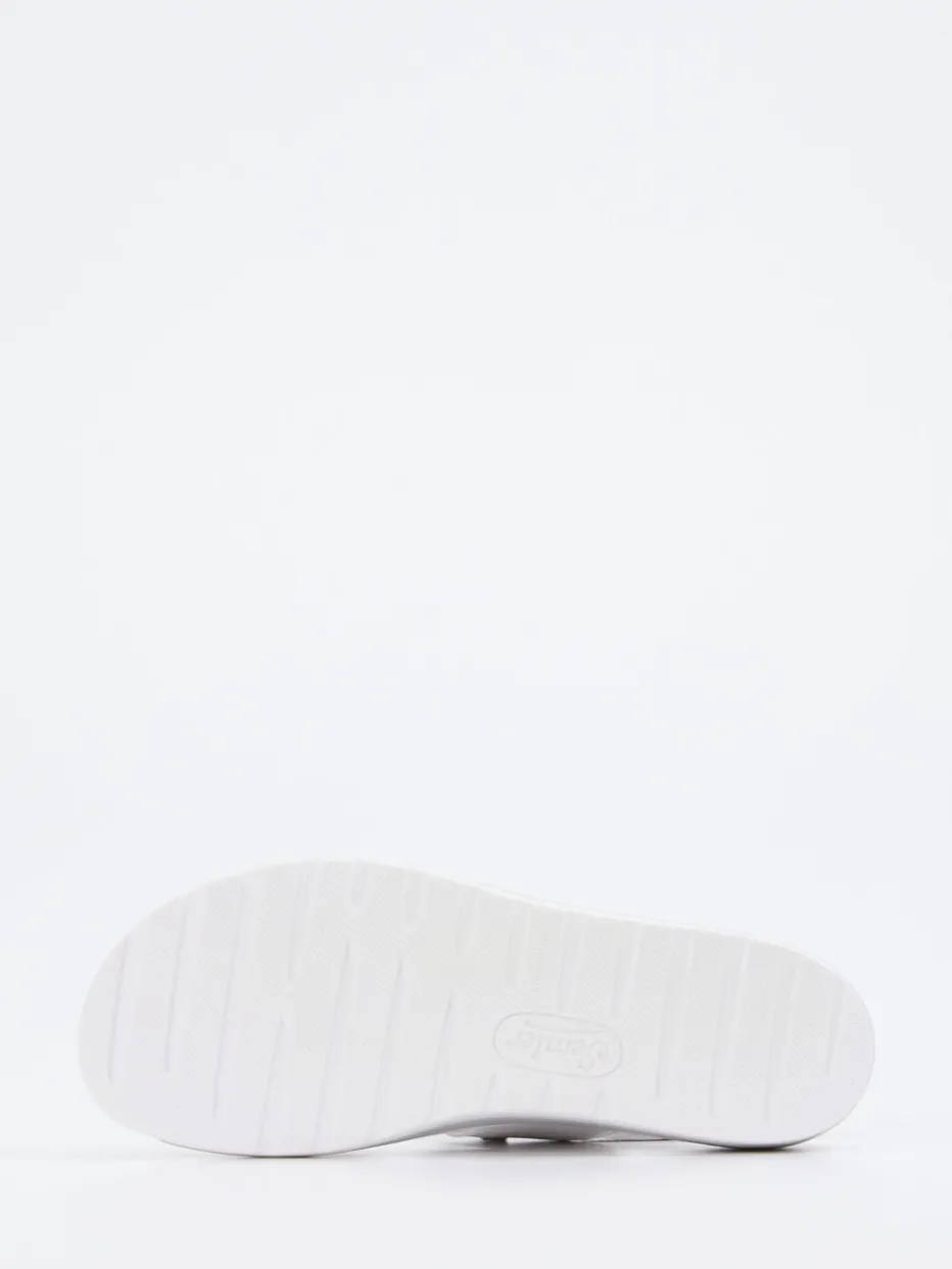 Minimalismus trifft Komfort.Semler präsentiert eine Damen-Sandalette aus der Komfortlinie mit Fokus auf hochwertigen Materialien und ergonomischer Passform. Ideal für lange Sommertage auf Reisen oder in der Stadt: Das weiche Kalbleder ist matt strukturiert und in frischem Weiß gehalten. Innen sorgt eine gepolsterte, velourslederbezogene Innensohle für ein angenehmes Tragegefühl – bei Bedarf sogar mit eigenen Einlagen dank herausnehmbarem Fußbett. Die offene, ergonomische Silhouette wird durch breite Riemen und drei individuell einstellbare Klettverschlüsse ergänzt. Dezente Ton-in-Ton-Nähte und ein silberfarbener Fersenakzent unterstreichen den puristischen Stil im Zeichen von „Quiet Luxury“. Semler steht für kombiniert modische Ästhetik mit orthopädischem Mehrwert.