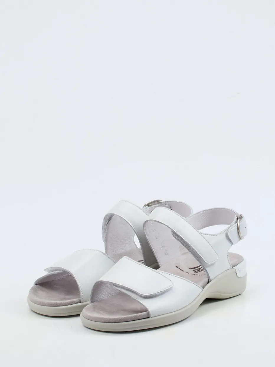 Sommerkomfort mit Stil.Semler präsentiert eine bequeme Damen-Klettsandalette für Alltag und Freizeit. Für entspannte Stunden im Freien bietet diese Sandale rutschhemmende Sicherheit, eine ergonomische Formsprache und ein weiches Tragegefühl. Weißes Kalbleder bildet das edle Obermaterial, ergänzt um ein samtig weiches Veloursleder-Fußbett. Der offene Schnitt mit verstellbaren Klettverschlüssen sowie einem Fersenriemen mit Metallschnalle erlaubt individuelle Passform – ideal für Einlagen. Die dezente Farbgestaltung in Uni-Weiß mit hellgrauen Akzenten passt besonders gut zu Leinen-Looks oder pastelligen Accessoires. Ein komfortbetonter Sommerbegleiter im minimalistischen Look mit funktionalem Design.