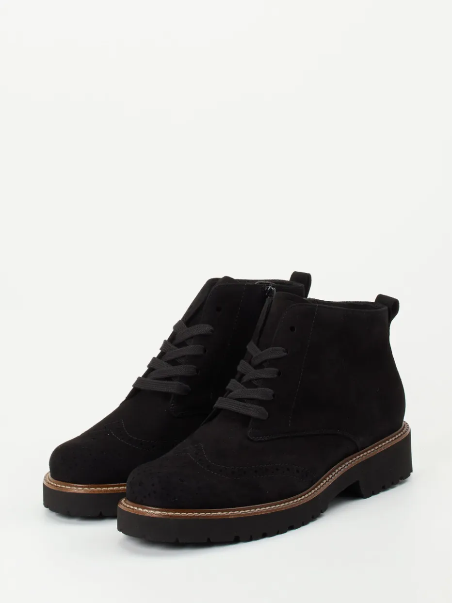 Ideal für wechselhafte Tage in der Stadt, setzen diese Damen-Boots auf schwarzes Veloursleder, das samtig-matt erscheint und durch feine Lochstanzung sowie tonige Nähte veredelt wird. Die knöchelhohe Silhouette mit rund zulaufender Front bietet, Dank Innenreißverschluss, komfortablen Einstieg und sicheren Halt. Die tief profilierte Gummisohle mit hellem Rahmen sorgt für Trittsicherheit bei gleichzeitig modischer Aussage. Die Weite H sowie das herausnehmbare Fußbett unterstützen Fußkomfort auch bei langem Tragen. Ein ausbalancierter Mix aus Heritage-Flair und Utility-Trend.
