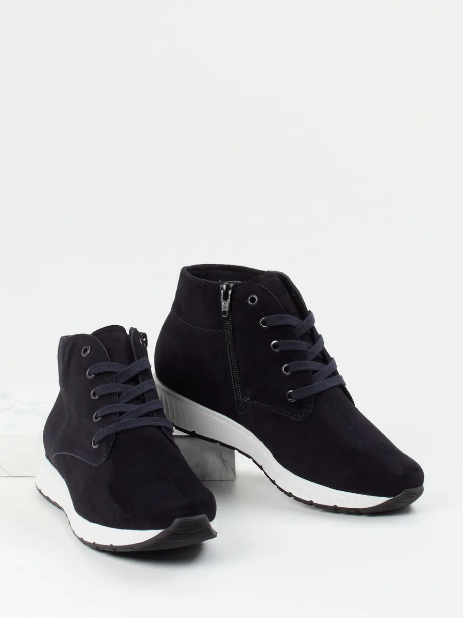 Ideal für entspannte Alltagssituationen, vereinen diese Boots mitternachtsblaues Veloursleder – samtig matt strukturiert – mit schlanker, knöchelhoher Silhouette. Schnürung und innenliegender Reißverschluss erleichtern das Anpassen und Anziehen. Eine weiße Profilsohle mit Luftpolsterung sorgt für gelenkschonenden Komfort. Details wie schwarze Ösen und Ton-in-Ton-Nähte unterstreichen den reduzierten Look. Eine komfortorientierte Wahl für casual-orientierte, trendbewusste Trägerinnen. Kombiniert mit Steppjacken und Jogpants entsteht ein moderner Urban-Relax-Stil.