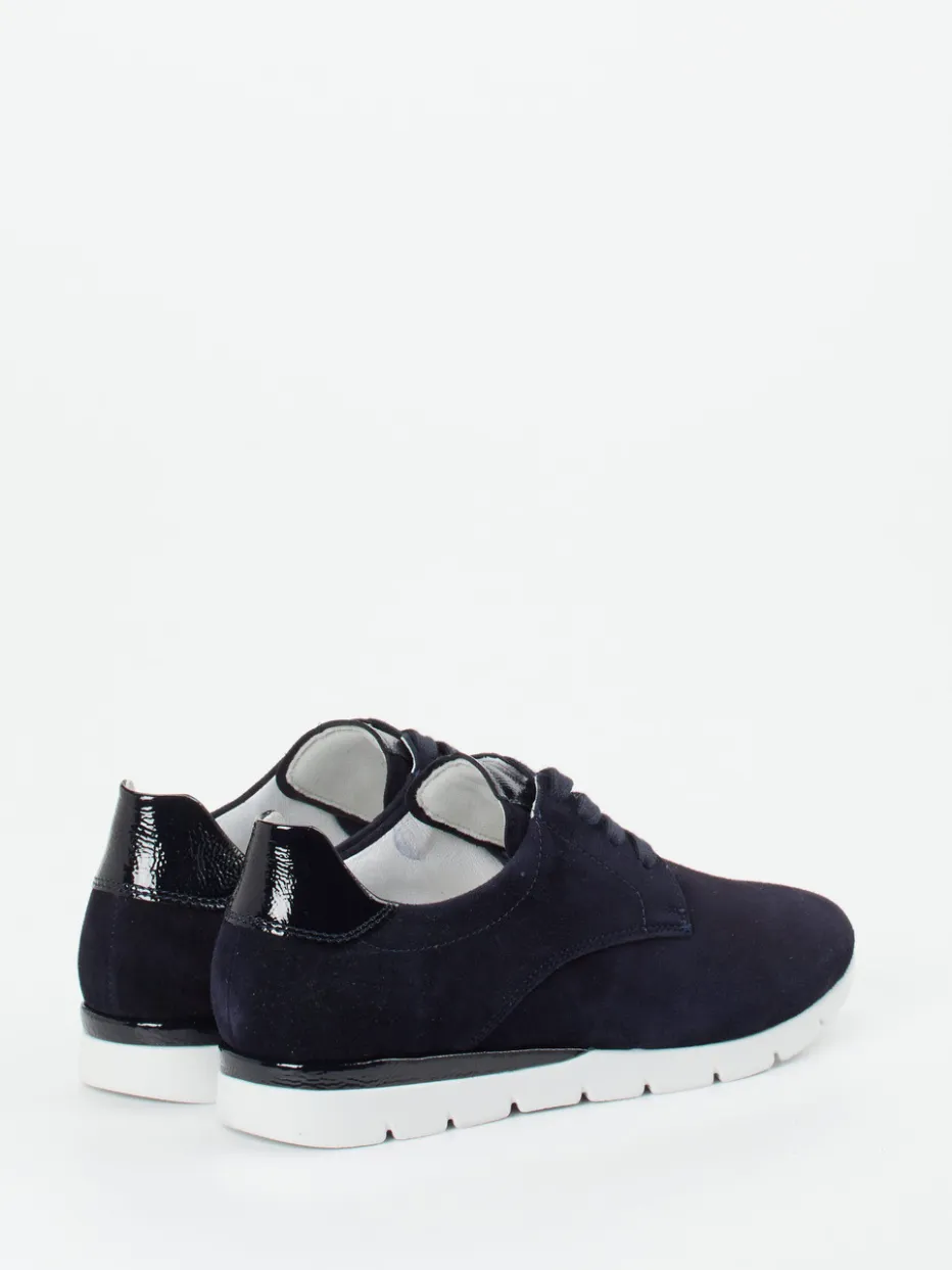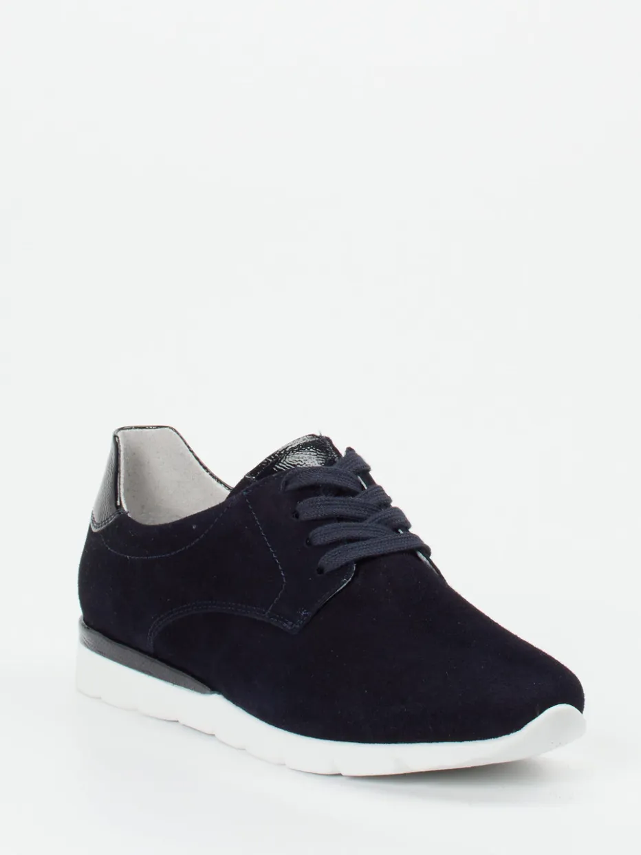 Stilsicher durch den Alltag.Der Semler Schnürschuh für Damen verbindet Casual-Komfort mit eleganter Zurückhaltung. Für Tage, an denen ganztägiger Komfort gefragt ist, bietet das Modell aus dunkelblauem Veloursleder mit samtiger Oberfläche und schwarzen Lackdetails an Ferse und Zunge ein visuelles Highlight. Die leichte, flexible PU-Sohle mit Luftpolster in Weiß sorgt für Dämpfung und unterstreicht mit dem schwarzen Kontraststreifen den modernen Materialmix. Die runde Silhouette, die dezente Schnürung und das weiche Leder-Textilfutter komplettieren den harmonischen Look. Inspiriert von Streetwear und den Trends „Quiet Luxury“ sowie „Materialkontraste AW24“, passt dieser Sneaker ideal zu minimalistischen Styles – von feiner Stoffhose bis zur Crossbody-Bag. Alltagsfreundliches Design trifft auf die bewährte Semler-Komfortqualität.