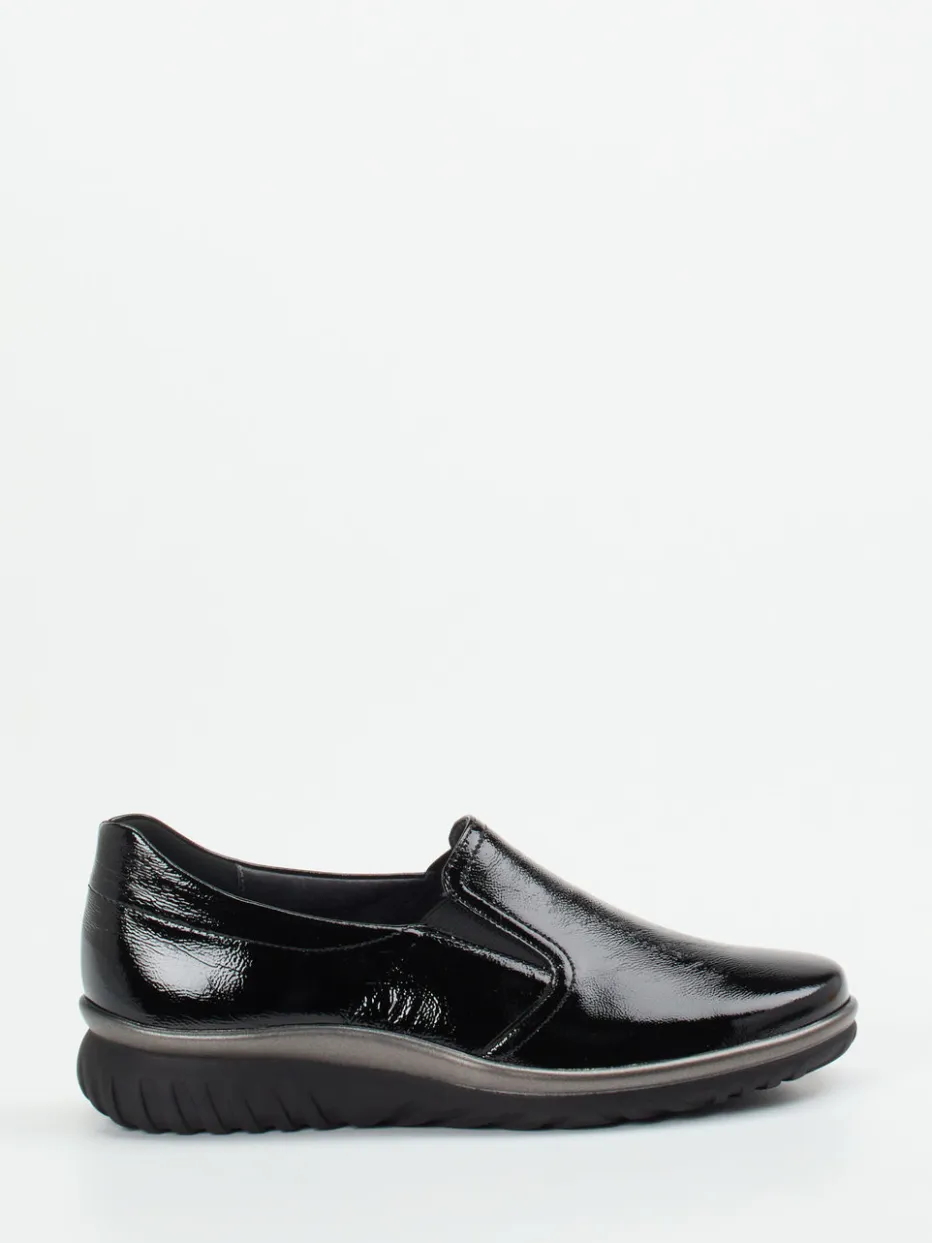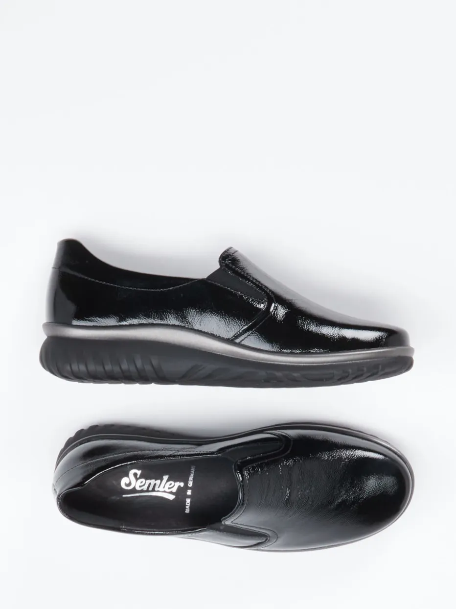 Elegant und komfortbewusst.Semler zeigt mit diesem Damen-Komfortslipper eine gelungene Verbindung aus Stil und Funktion. Für längere Tage im Büro oder entspannte Stunden in der Stadt bietet dieser schwarze Slipper aus hochwertigem, glänzendem Lackleder angenehmen Tragekomfort. Elastikeinsätze an beiden Seiten erleichtern das Hineinschlüpfen und erhöhen die Flexibilität beim Gehen. Die ergonomisch aufgebaute PU-Sohle ist rutschhemmend profiliert und sorgt für ein sicheres Laufgefühl, auch bei glatten Untergründen. Das Innenfutter aus Leder-Textil-Mix sowie das herausnehmbare Fußbett machen ihn ideal für orthopädische Einlagen. Durch die zeitlose Optik und dezente Details lässt sich das Modell vielseitig kombinieren – ob zur Stretchhose oder zum Businesskleid. Semler-Komfort trifft auf minimalistischen Stil – ideal für gepflegte Alltagslooks.