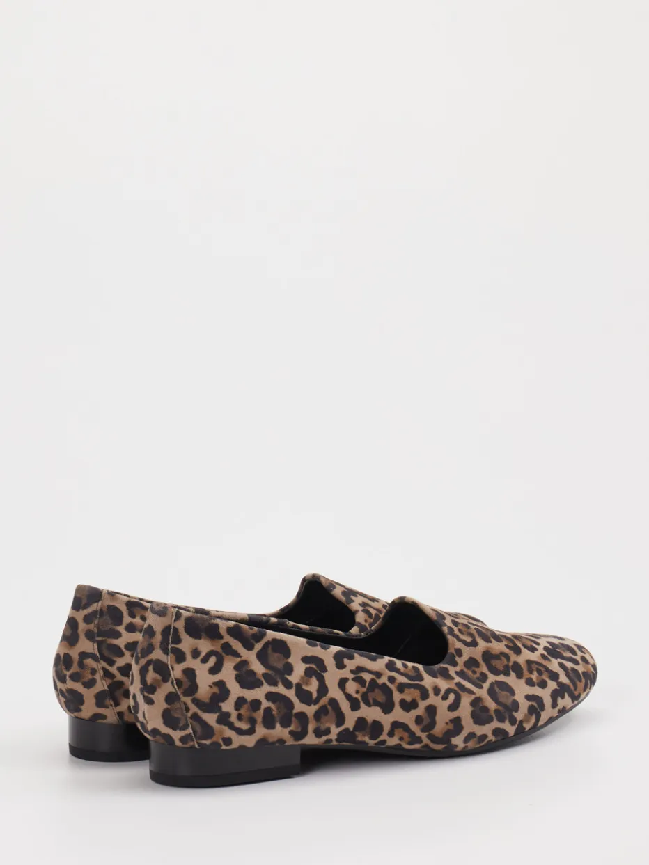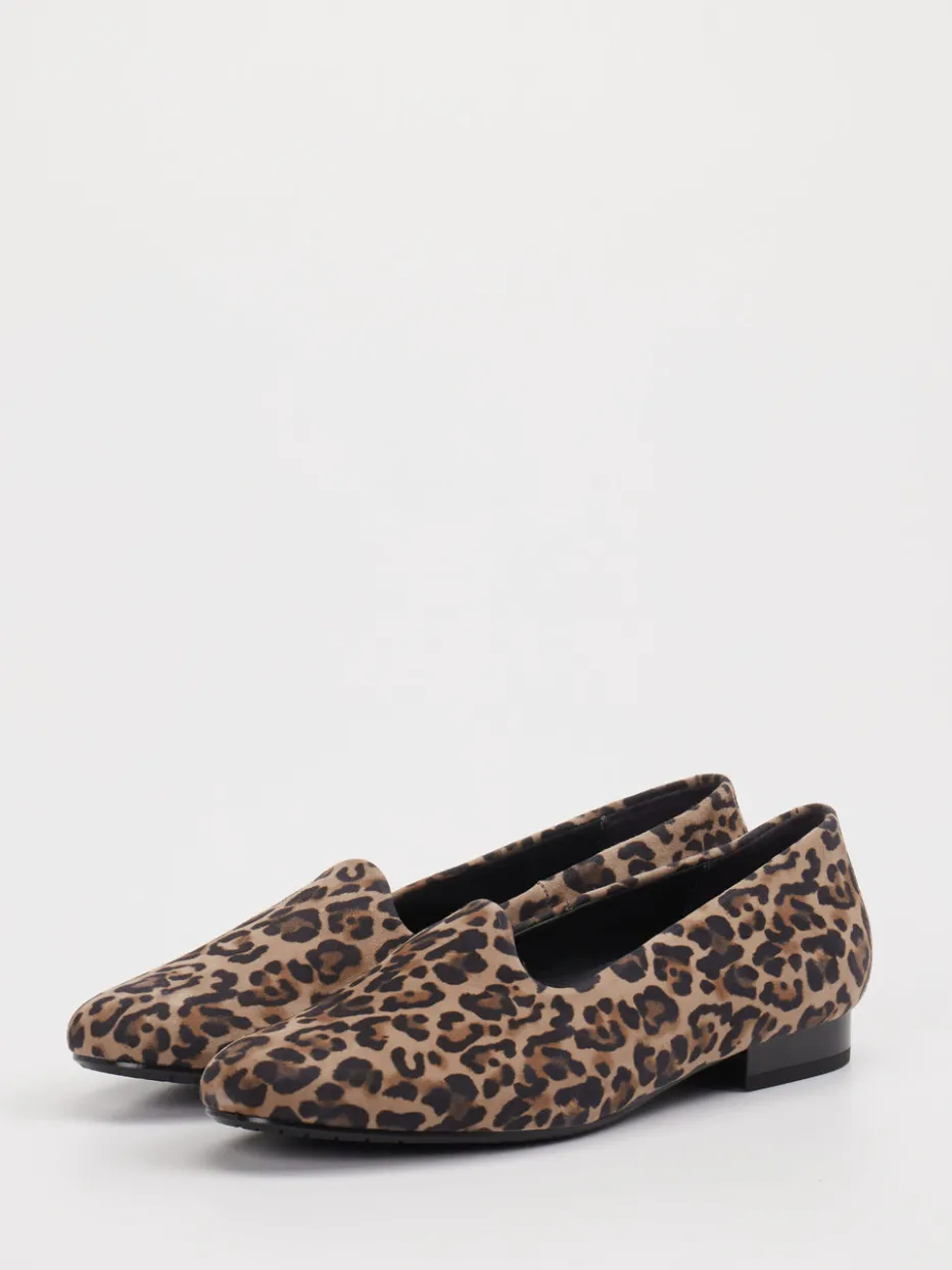 Ideal für Büro oder Freizeit bietet das Modell aus geprägtem Leder in matter Veloursoptik eine angenehm flache Silhouette mit bequemem Einstieg in Schlupfform. Das braune Leomuster wirkt stilvoll und modern, während Details wie Ton-in-Ton-Nähte und die abgerundete Zehenpartie das zurückhaltende Design unterstreichen. Die flexible Gummisohle und der 1,5 cm hohe Blockabsatz sorgen für entspannten Gehkomfort. Stilistisch bewegt sich der Schuh zwischen Casual Chic und Businesstauglichkeit – besonders harmonisch zu schwarzen Stoffhosen.