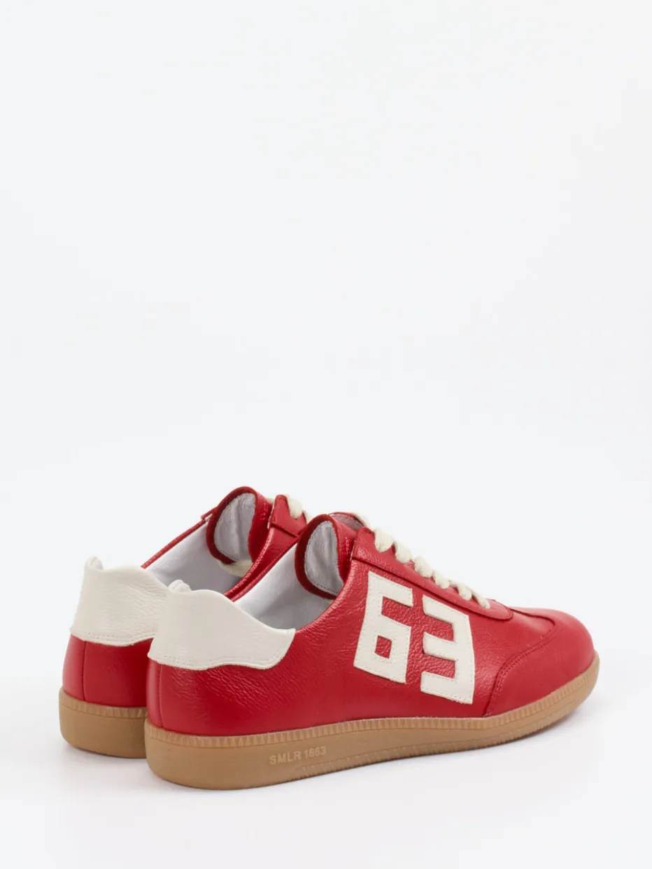 Ideal für lässige Stadtspaziergänge oder aktive Alltagsoutfits: Das signalrote Kalbleder ist fein genarbt und durch weiße Kontrasteinsätze an Ferse und Außenseite dekorativ hervorgehoben. Eine flexible Honig-Gummisohle mit Luftpolster sorgt gemeinsam mit Weite H und wechselbarem Fußbett für spürbaren Komfort. Mit seitlichem „63“-Print greift das Design sportliche Retro-Vibes der Y2K-Ära auf. Lässt sich stilvoll zu Jeans oder Jogpants kombinieren.