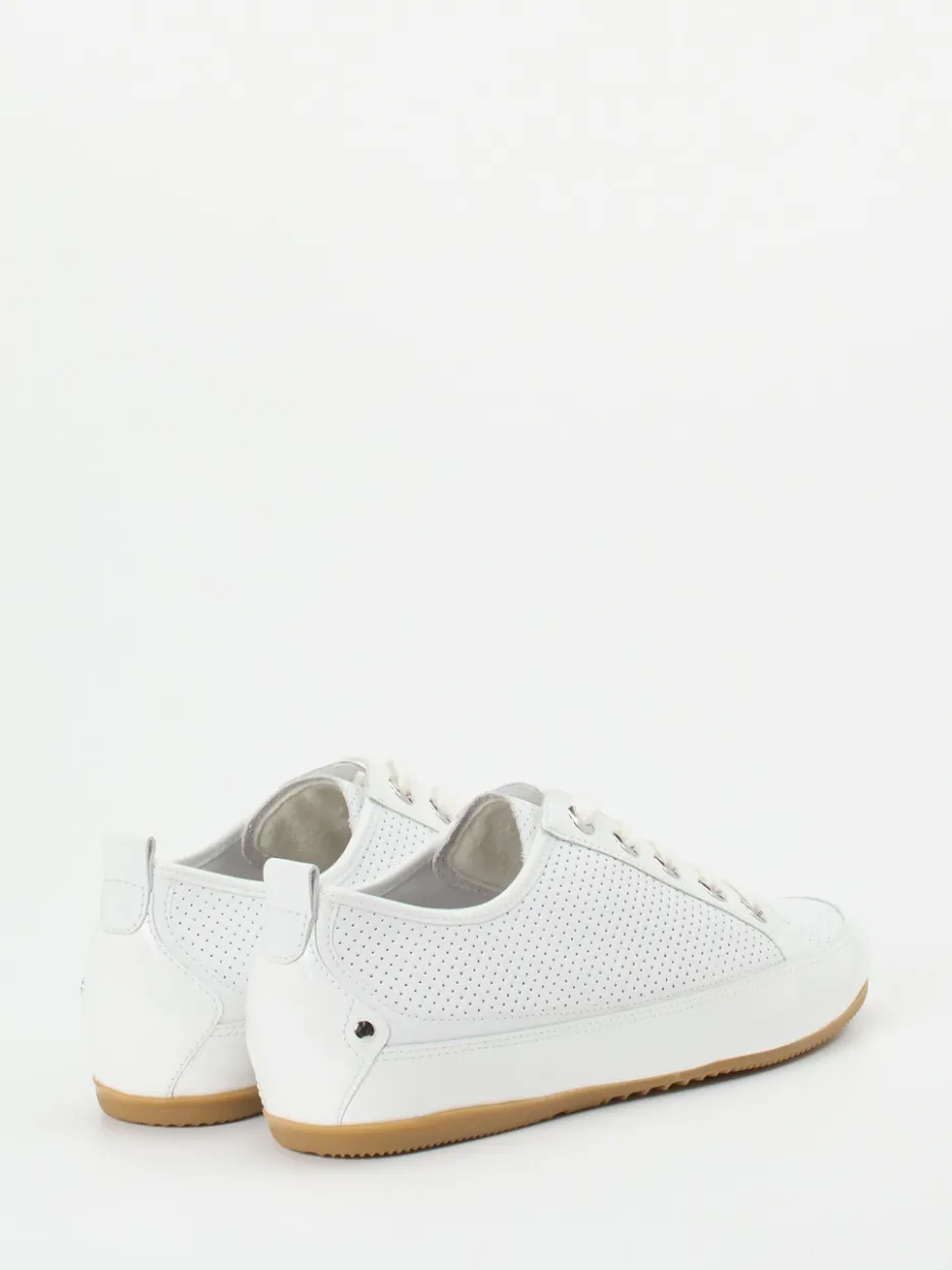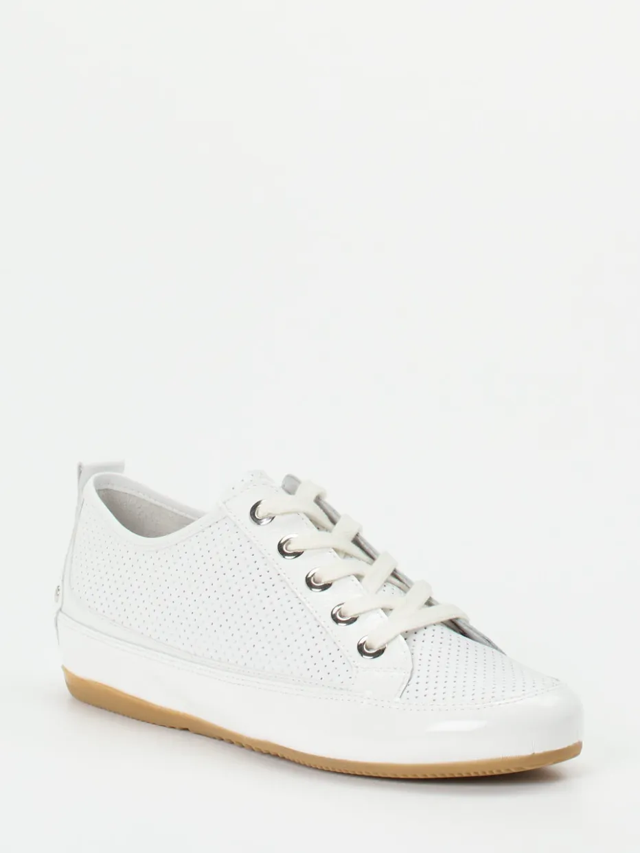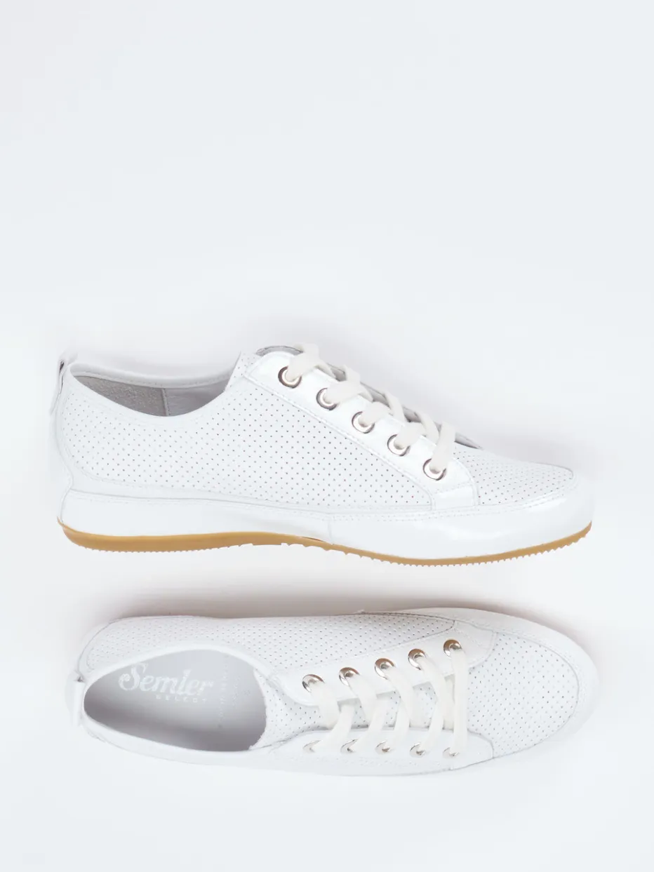 Leichtigkeit trifft auf subtile Eleganz.Semler präsentiert diesen Low-Top Damen-Sneaker als idealen Begleiter für entspannte Sommermomente. Er passt sich Alltagssituationen mit Leichtigkeit an – vom Spaziergang in der Stadt bis zum Müßiggang auf der Terrasse. Gefertigt aus weichem Kalbleder mit glänzenden Lackleder-Akzenten, überzeugt das Modell durch eine perforierte Oberfläche, die sommerliche Atmungsaktivität ermöglicht. Die weiße Grundfarbe wird durch silberfarbene Ösen, breite Satin-Schnürsenkel und eine rutschfeste Gummisohle in Kontrastoptik ergänzt. Die klassische Silhouette mit Zuglasche steht für schlichte Eleganz. Modisch einzuordnen im Clean Sneaker Trend SS24, ideal zu Leinenhose oder Sommerkleid. Mit herausnehmbarem Fußbett für Einlagen und komfortgenauer Weite G – made for quiet sophistication.